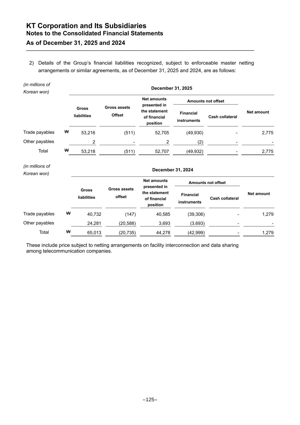 KT Corporation and Its Subsidiaries Notes to the Consolidated Financial Statements As of December 31, 2025 and 2024 2) Details of the Group’s financial liabilities recognized, subject to enforceable master netting arrangements or similar agreements, as of December 31, 2025 and 2024, are as follows: (in millions of Korean won) December 31, 2025 Gross liabilities Gross assets Offset Net amounts presented in the statement of financial position Amounts not offset Net amount Financial instruments Cash collateral Trade payables ₩ 53,216 (511) 52,705 (49,930) - 2,775 Other payables 2 - 2 (2) - - Total ₩ 53,218 (511) 52,707 (49,932) - 2,775 (in millions of Korean won) December 31, 2024 Gross liabilities Gross assets offset Net amounts presented in the statement of financial position Amounts not offset Net amount Financial instruments Cash collateral Trade payables ₩ 40,732 (147) 40,585 (39,306) - 1,279 Other payables 24,281 (20,588) 3,693 (3,693) - - Total ₩ 65,013 (20,735) 44,278 (42,999) - 1,279 These include price subject to netting arrangements on facility interconnection and data sharing among telecommunication companies. -125-