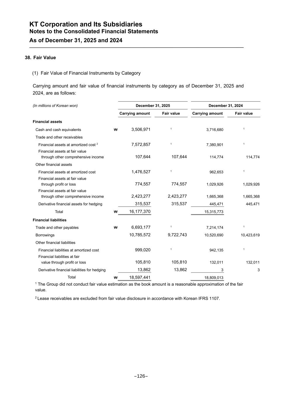 KT Corporation and Its Subsidiaries Notes to the Consolidated Financial Statements As of December 31, 2025 and 2024 38. Fair Value (1) Fair Value of Financial Instruments by Category Carrying amount and fair value of financial instruments by category as of December 31, 2025 and 2024, are as follows: (In millions of Korean won) December 31, 2025 December 31, 2024 Carrying amount Fair value Carrying amount Fair value Financial assets Cash and cash equivalents ₩ 3,506,971 1 3,716,680 1 Trade and other receivables Financial assets at amortized cost 2 7,572,857 1 7,380,901 1 Financial assets at fair value through other comprehensive income 107,644 107,644 114,774 114,774 Other financial assets Financial assets at amortized cost 1,476,527 1 962,653 1 Financial assets at fair value through profit or loss 774,557 774,557 1,029,926 1,029,926 Financial assets at fair value through other comprehensive income 2,423,277 2,423,277 1,665,368 1,665,368 Derivative financial assets for hedging 315,537 315,537 445,471 445,471 Total ₩ 16,177,370 15,315,773 Financial liabilities Trade and other payables ₩ 6,693,177 1 7,214,174 1 Borrowings 10,785,572 9,722,743 10,520,690 10,423,619 Other financial liabilities Financial liabilities at amortized cost 999,020 1 942,135 1 Financial liabilities at fair value through profit or loss 105,810 105,810 132,011 132,011 Derivative financial liabilities for hedging 13,862 13,862 3 3 Total ₩ 18,597,441 18,809,013 1 The Group did not conduct fair value estimation as the book amount is a reasonable approximation of the fair value. 2 Lease receivables are excluded from fair value disclosure in accordance with Korean IFRS 1107. -126-