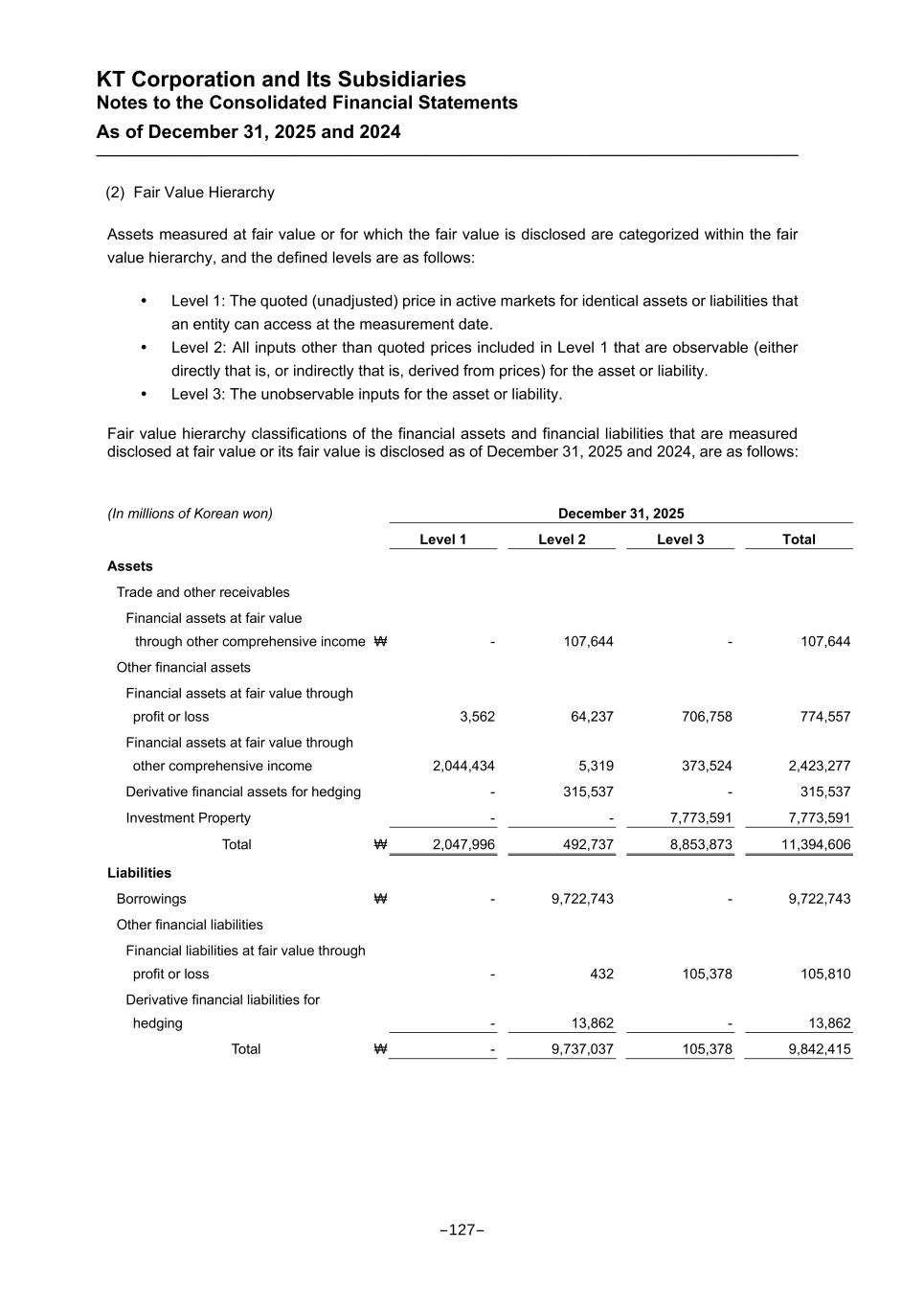 KT Corporation and Its Subsidiaries Notes to the Consolidated Financial Statements As of December 31, 2025 and 2024 (2) Fair Value Hierarchy Assets measured at fair value or for which the fair value is disclosed are categorized within the fair value hierarchy, and the defined levels are as follows: Level 1: The quoted (unadjusted) price in active markets for identical assets or liabilities that an entity can access at the measurement date. Level 2: All inputs other than quoted prices included in Level 1 that are observable (either directly that is, or indirectly that is, derived from prices) for the asset or liability. Level 3: The unobservable inputs for the asset or liability. Fair value hierarchy classifications of the financial assets and financial liabilities that are measured disclosed at fair value or its fair value is disclosed as of December 31, 2025 and 2024, are as follows: (In millions of Korean won) December 31, 2025 Level 1 Level 2 Level 3 Total Assets Trade and other receivables Financial assets at fair value through other comprehensive income ₩ - 107,644 - 107,644 Other financial assets Financial assets at fair value through profit or loss 3,562 64,237 706,758 774,557 Financial assets at fair value through other comprehensive income 2,044,434 5,319 373,524 2,423,277 Derivative financial assets for hedging - 315,537 - 315,537 Investment Property - - 7,773,591 7,773,591 Total ₩ 2,047,996 492,737 8,853,873 11,394,606 Liabilities Borrowings ₩ - 9,722,743 - 9,722,743 Other financial liabilities Financial liabilities at fair value through profit or loss - 432 105,378 105,810 Derivative financial liabilities for hedging - 13,862 - 13,862 Total ₩ - 9,737,037 105,378 9,842,415 -127-