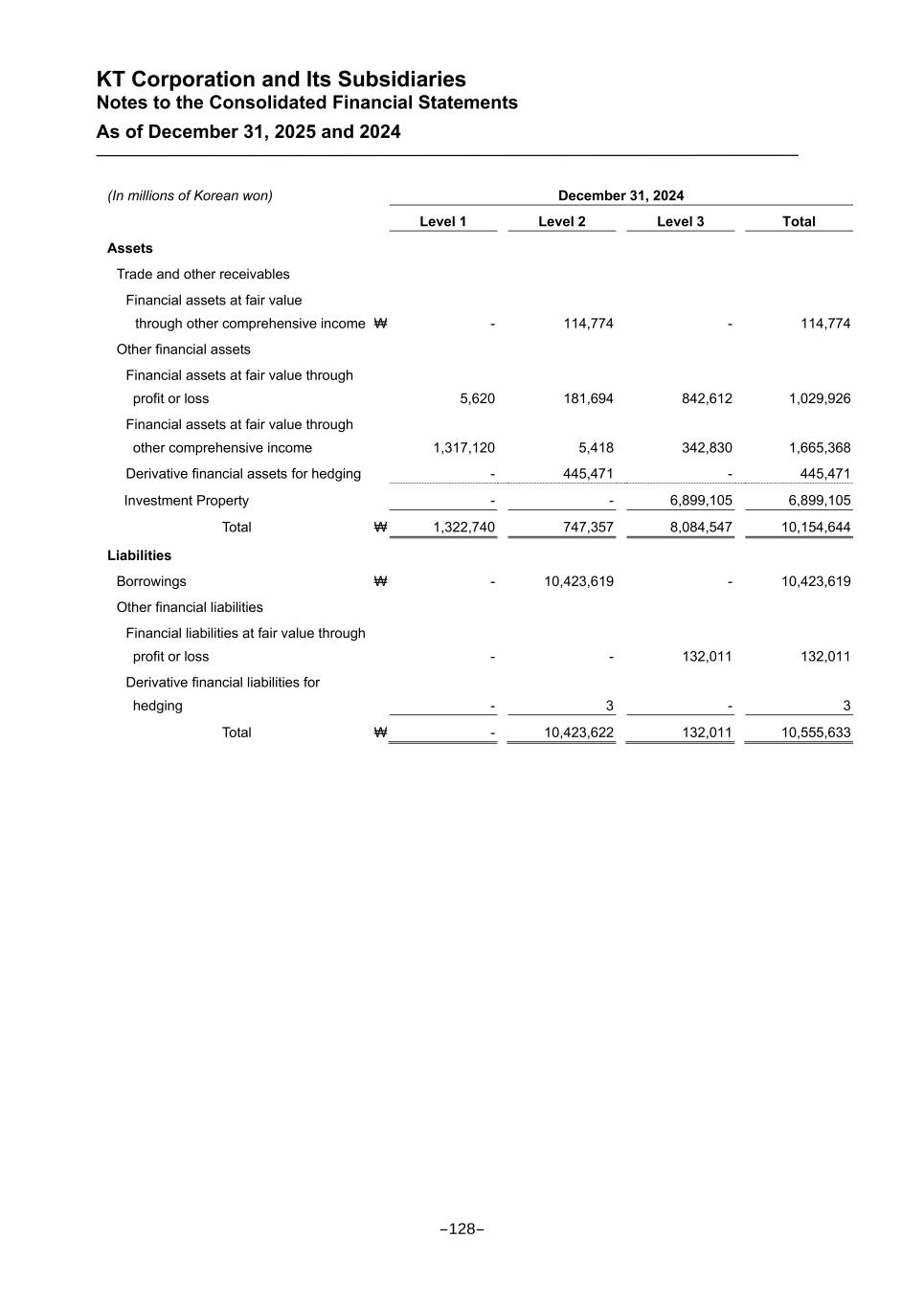 KT Corporation and Its Subsidiaries Notes to the Consolidated Financial Statements As of December 31, 2025 and 2024 (In millions of Korean won) December 31, 2024 Level 1 Level 2 Level 3 Total Assets Trade and other receivables Financial assets at fair value through other comprehensive income ₩ - 114,774 - 114,774 Other financial assets Financial assets at fair value through profit or loss 5,620 181,694 842,612 1,029,926 Financial assets at fair value through other comprehensive income 1,317,120 5,418 342,830 1,665,368 Derivative financial assets for hedging - 445,471 - 445,471 Investment Property - - 6,899,105 6,899,105 Total ₩ 1,322,740 747,357 8,084,547 10,154,644 Liabilities Borrowings ₩ - 10,423,619 - 10,423,619 Other financial liabilities Financial liabilities at fair value through profit or loss - - 132,011 132,011 Derivative financial liabilities for hedging - 3 - 3 Total ₩ - 10,423,622 132,011 10,555,633 -128-