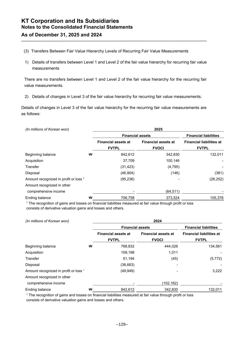 KT Corporation and Its Subsidiaries Notes to the Consolidated Financial Statements As of December 31, 2025 and 2024 (3) Transfers Between Fair Value Hierarchy Levels of Recurring Fair Value Measurements 1) Details of transfers between Level 1 and Level 2 of the fair value hierarchy for recurring fair value measurements There are no transfers between Level 1 and Level 2 of the fair value hierarchy for the recurring fair value measurements. 2) Details of changes in Level 3 of the fair value hierarchy for recurring fair value measurements. Details of changes in Level 3 of the fair value hierarchy for the recurring fair value measurements are as follows: (In millions of Korean won) 2025 Financial assets Financial liabilities Financial assets at FVTPL Financial assets at FVOCI Financial liabilities at FVTPL Beginning balance ₩ 842,612 342,830 132,011 Acquisition 37,709 100,146 - Transfer (31,423) (4,795) - Disposal (46,904) (146) (381) Amount recognized in profit or loss 1 (95,236) - (26,252) Amount recognized in other comprehensive income - (64,511) - Ending balance ₩ 706,758 373,524 105,378 1 The recognition of gains and losses on financial liabilities measured at fair value through profit or loss consists of derivative valuation gains and losses and others. (In millions of Korean won) 2024 Financial assets Financial liabilities Financial assets at FVTPL Financial assets at FVOCI Financial liabilities at FVTPL Beginning balance ₩ 768,832 444,026 134,561 Acquisition 109,198 1,011 - Transfer 51,194 (45) (5,772) Disposal (36,663) - - Amount recognized in profit or loss 1 (49,949) - 3,222 Amount recognized in other comprehensive income - (102,162) - Ending balance ₩ 842,612 342,830 132,011 1 The recognition of gains and losses on financial liabilities measured at fair value through profit or loss consists of derivative valuation gains and losses and others. -129-