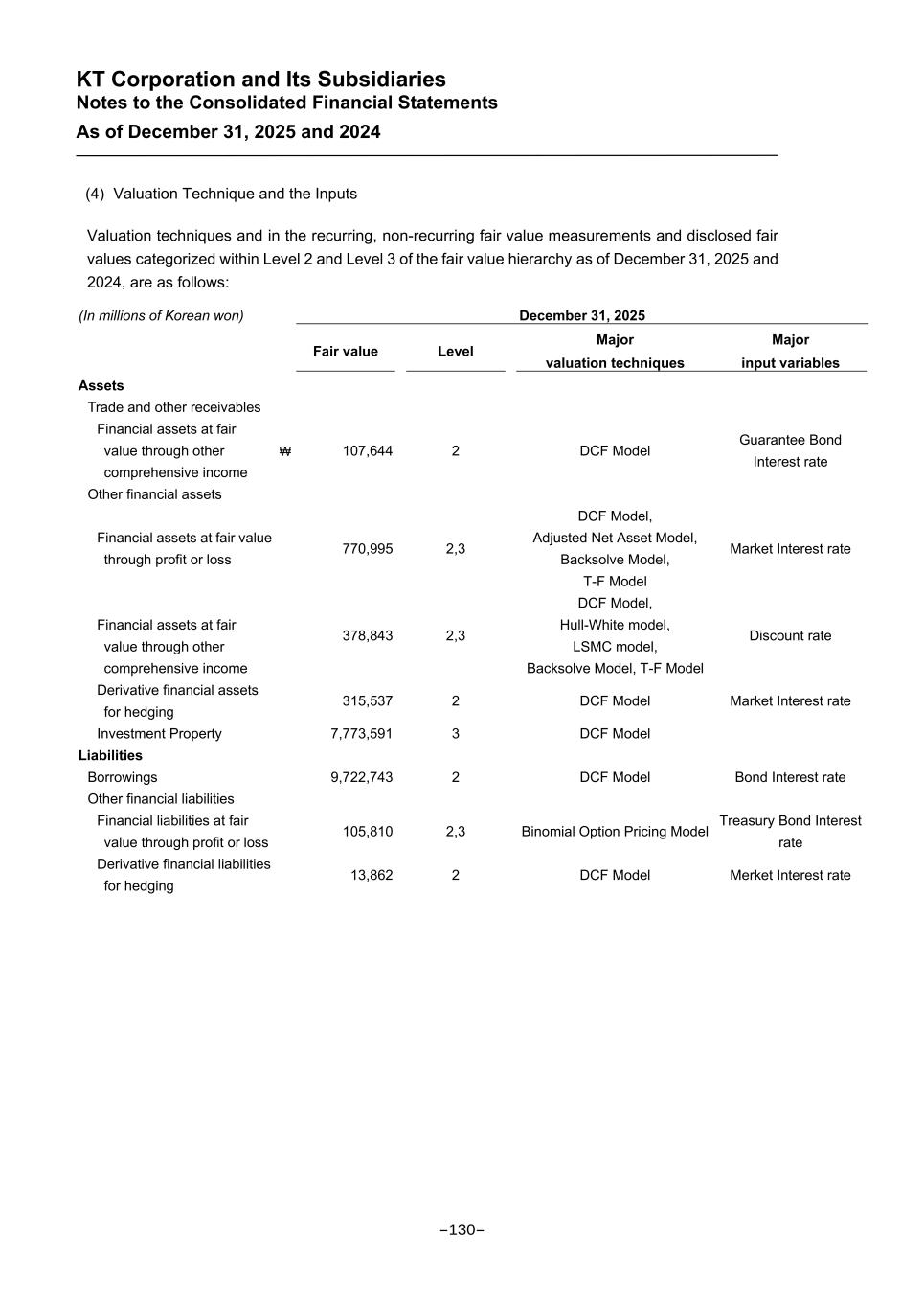 KT Corporation and Its Subsidiaries Notes to the Consolidated Financial Statements As of December 31, 2025 and 2024 (4) Valuation Technique and the Inputs Valuation techniques and in the recurring, non-recurring fair value measurements and disclosed fair values categorized within Level 2 and Level 3 of the fair value hierarchy as of December 31, 2025 and 2024, are as follows: (In millions of Korean won) December 31, 2025 Fair value Level Major valuation techniques Major input variables Assets Trade and other receivables Financial assets at fair value through other comprehensive income ₩ 107,644 2 DCF Model Guarantee Bond Interest rate Other financial assets Financial assets at fair value through profit or loss 770,995 2,3 DCF Model, Adjusted Net Asset Model, Backsolve Model, T-F Model Market Interest rate Financial assets at fair value through other comprehensive income 378,843 2,3 DCF Model, Hull-White model, LSMC model, Backsolve Model, T-F Model Discount rate Derivative financial assets for hedging 315,537 2 DCF Model Market Interest rate Investment Property 7,773,591 3 DCF Model Liabilities Borrowings 9,722,743 2 DCF Model Bond Interest rate Other financial liabilities Financial liabilities at fair value through profit or loss 105,810 2,3 Binomial Option Pricing Model Treasury Bond Interest rate Derivative financial liabilities for hedging 13,862 2 DCF Model Merket Interest rate -130-