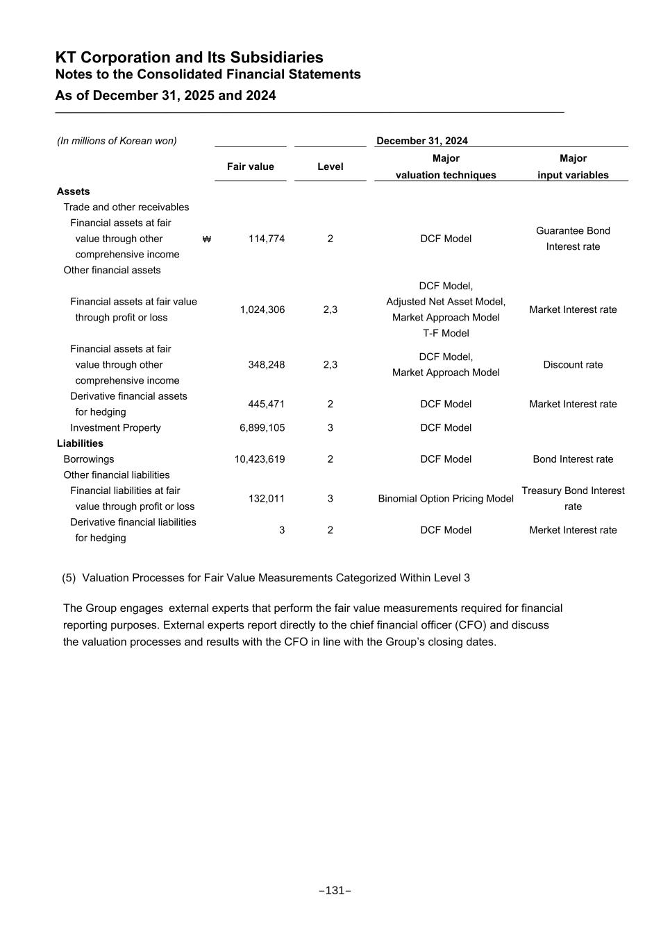 KT Corporation and Its Subsidiaries Notes to the Consolidated Financial Statements As of December 31, 2025 and 2024 (In millions of Korean won) December 31, 2024 Fair value Level Major valuation techniques Major input variables Assets Trade and other receivables Financial assets at fair value through other comprehensive income ₩ 114,774 2 DCF Model Guarantee Bond Interest rate Other financial assets Financial assets at fair value through profit or loss 1,024,306 2,3 DCF Model, Adjusted Net Asset Model, Market Approach Model T-F Model Market Interest rate Financial assets at fair value through other comprehensive income 348,248 2,3 DCF Model, Market Approach Model Discount rate Derivative financial assets for hedging 445,471 2 DCF Model Market Interest rate Investment Property 6,899,105 3 DCF Model Liabilities Borrowings 10,423,619 2 DCF Model Bond Interest rate Other financial liabilities Financial liabilities at fair value through profit or loss 132,011 3 Binomial Option Pricing Model Treasury Bond Interest rate Derivative financial liabilities for hedging 3 2 DCF Model Merket Interest rate (5) Valuation Processes for Fair Value Measurements Categorized Within Level 3 The Group engages external experts that perform the fair value measurements required for financial reporting purposes. External experts report directly to the chief financial officer (CFO) and discuss the valuation processes and results with the CFO in line with the Group’s closing dates. -131-