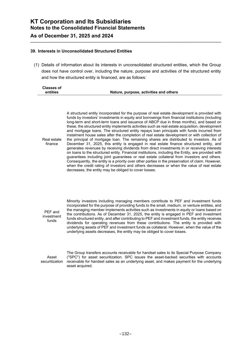 KT Corporation and Its Subsidiaries Notes to the Consolidated Financial Statements As of December 31, 2025 and 2024 39. Interests in Unconsolidated Structured Entities (1) Details of information about its interests in unconsolidated structured entities, which the Group does not have control over, including the nature, purpose and activities of the structured entity and how the structured entity is financed, are as follows: Classes of entities Nature, purpose, activities and others Real estate finance A structured entity incorporated for the purpose of real estate development is provided with funds by investors’ investments in equity and borrowings from financial institutions (including long-term and short-term loans and issuance of ABCP due in three months), and based on these, the structured entity implements activities such as real estate acquisition, development and mortgage loans. The structured entity repays loan principals with funds incurred from instalment house sales after the completion of real estate development or with collection of the principal of mortgage loan. The remaining shares are distributed to investors. As of December 31, 2025, this entity is engaged in real estate finance structured entity, and generates revenues by receiving dividends from direct investments in or receiving interests on loans to the structured entity. Financial institutions, including the Entity, are provided with guarantees including joint guarantees or real estate collateral from investors and others. Consequently, the entity is a priority over other parties in the preservation of claim. However, when the credit rating of investors and others decreases or when the value of real estate decreases, the entity may be obliged to cover losses. PEF and investment funds Minority investors including managing members contribute to PEF and investment funds incorporated for the purpose of providing funds to the small, medium, or venture entities, and the managing member implements activities such as investments in equity or loans based on the contributions. As of December 31, 2025, the entity is engaged in PEF and investment funds structured entity, and after contributing to PEF and investment funds, the entity receives dividends for operating revenues from these contributions. The entity is provided with underlying assets of PEF and investment funds as collateral. However, when the value of the underlying assets decreases, the entity may be obliged to cover losses. Asset securitization The Group transfers accounts receivable for handset sales to its Special Purpose Company ("SPC") for asset securitization. SPC issues the asset-backed securities with accounts receivable for handset sales as an underlying asset, and makes payment for the underlying asset acquired. -132-