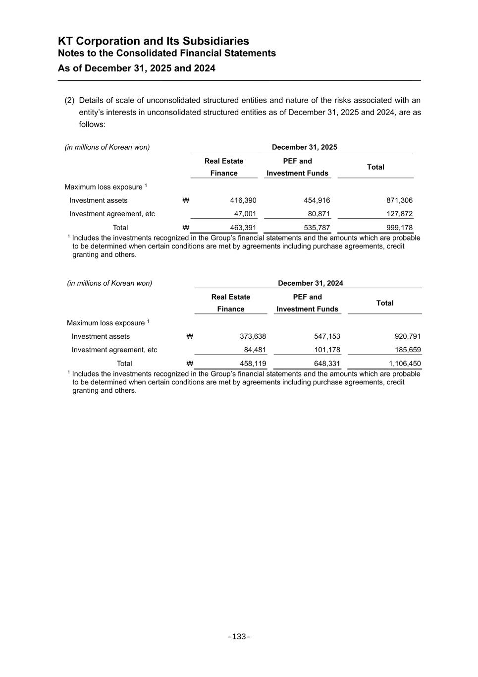 KT Corporation and Its Subsidiaries Notes to the Consolidated Financial Statements As of December 31, 2025 and 2024 (2) Details of scale of unconsolidated structured entities and nature of the risks associated with an entity’s interests in unconsolidated structured entities as of December 31, 2025 and 2024, are as follows: 1 Includes the investments recognized in the Group’s financial statements and the amounts which are probable to be determined when certain conditions are met by agreements including purchase agreements, credit granting and others. (in millions of Korean won) December 31, 2024 Real Estate Finance PEF and Investment Funds Total Maximum loss exposure 1 Investment assets ₩ 373,638 547,153 920,791 Investment agreement, etc 84,481 101,178 185,659 Total ₩ 458,119 648,331 1,106,450 1 Includes the investments recognized in the Group’s financial statements and the amounts which are probable to be determined when certain conditions are met by agreements including purchase agreements, credit granting and others. (in millions of Korean won) December 31, 2025 Real Estate Finance PEF and Investment Funds Total Maximum loss exposure 1 Investment assets ₩ 416,390 454,916 871,306 Investment agreement, etc 47,001 80,871 127,872 Total ₩ 463,391 535,787 999,178 -133-