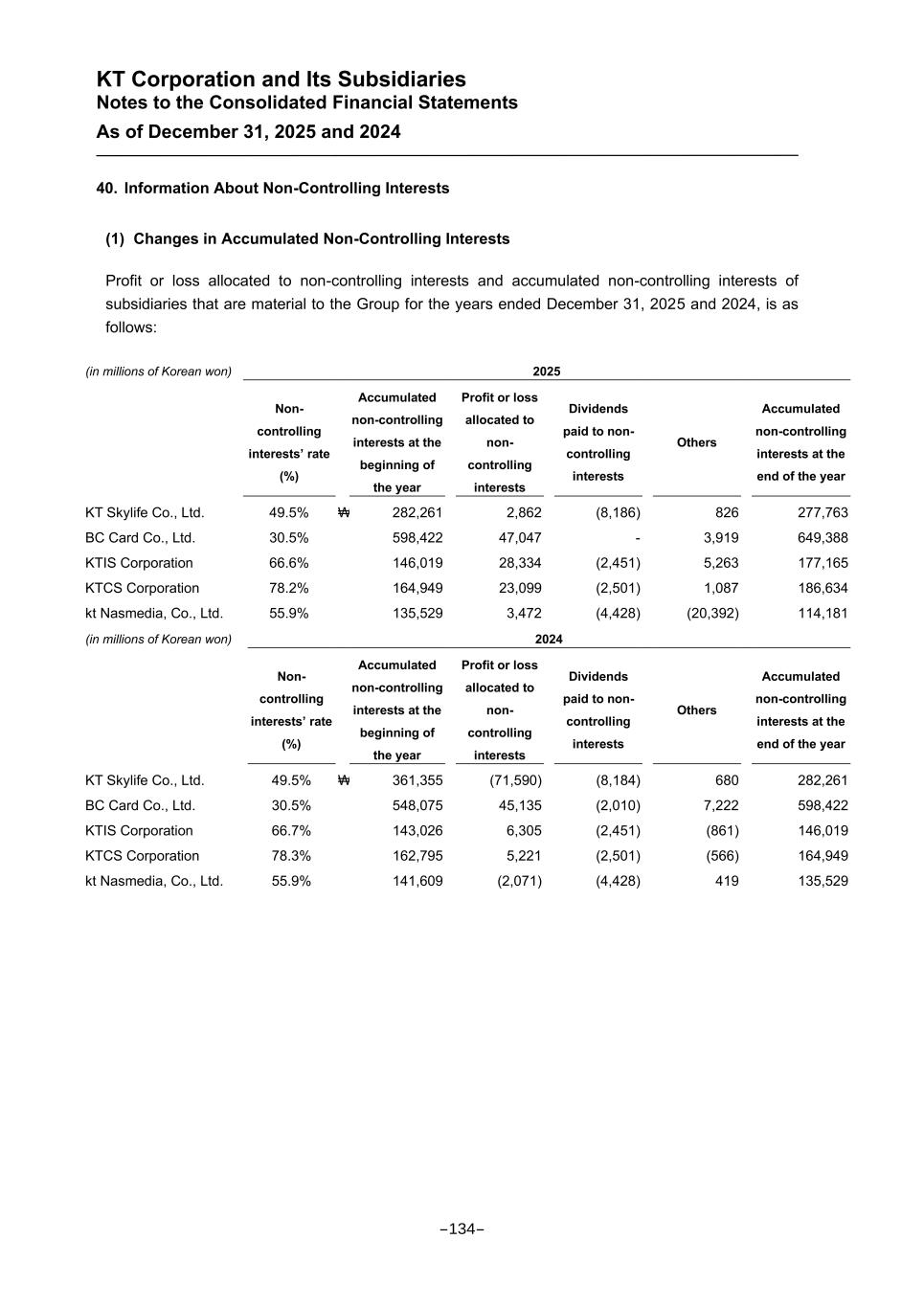 KT Corporation and Its Subsidiaries Notes to the Consolidated Financial Statements As of December 31, 2025 and 2024 40. Information About Non-Controlling Interests (1) Changes in Accumulated Non-Controlling Interests Profit or loss allocated to non-controlling interests and accumulated non-controlling interests of subsidiaries that are material to the Group for the years ended December 31, 2025 and 2024, is as follows: (in millions of Korean won) 2025 Non- controlling interests’ rate (%) Accumulated non-controlling interests at the beginning of the year Profit or loss allocated to non- controlling interests Dividends paid to non- controlling interests Others Accumulated non-controlling interests at the end of the year KT Skylife Co., Ltd. 49.5% ₩ 282,261 2,862 (8,186) 826 277,763 BC Card Co., Ltd. 30.5% 598,422 47,047 - 3,919 649,388 KTIS Corporation 66.6% 146,019 28,334 (2,451) 5,263 177,165 KTCS Corporation 78.2% 164,949 23,099 (2,501) 1,087 186,634 kt Nasmedia, Co., Ltd. 55.9% 135,529 3,472 (4,428) (20,392) 114,181 (in millions of Korean won) 2024 Non- controlling interests’ rate (%) Accumulated non-controlling interests at the beginning of the year Profit or loss allocated to non- controlling interests Dividends paid to non- controlling interests Others Accumulated non-controlling interests at the end of the year KT Skylife Co., Ltd. 49.5% ₩ 361,355 (71,590) (8,184) 680 282,261 BC Card Co., Ltd. 30.5% 548,075 45,135 (2,010) 7,222 598,422 KTIS Corporation 66.7% 143,026 6,305 (2,451) (861) 146,019 KTCS Corporation 78.3% 162,795 5,221 (2,501) (566) 164,949 kt Nasmedia, Co., Ltd. 55.9% 141,609 (2,071) (4,428) 419 135,529 -134-