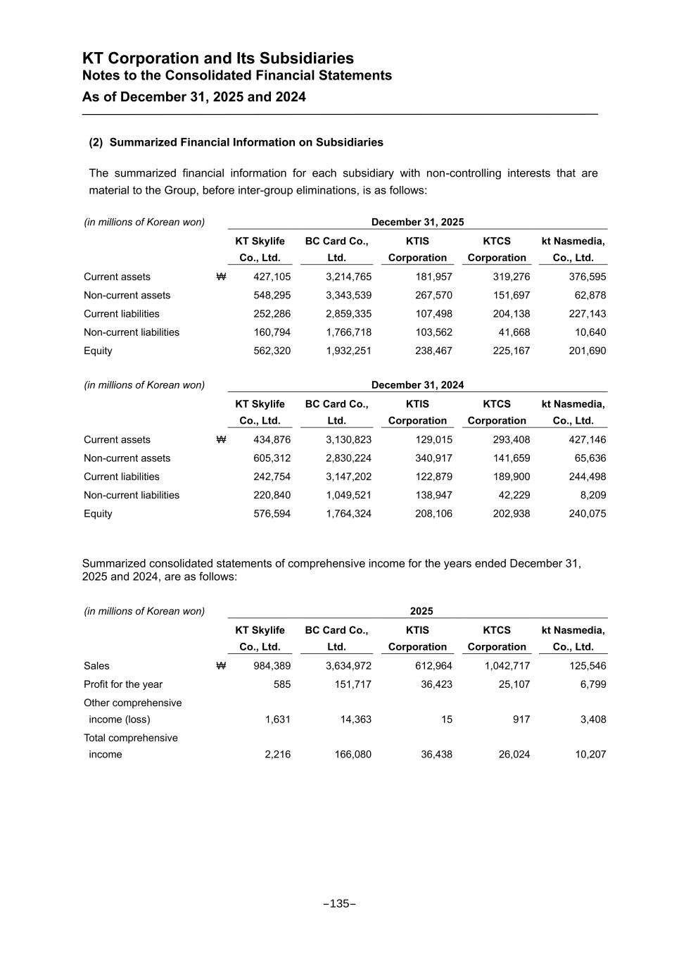 KT Corporation and Its Subsidiaries Notes to the Consolidated Financial Statements As of December 31, 2025 and 2024 (2) Summarized Financial Information on Subsidiaries The summarized financial information for each subsidiary with non-controlling interests that are material to the Group, before inter-group eliminations, is as follows: (in millions of Korean won) December 31, 2025 KT Skylife Co., Ltd. BC Card Co., Ltd. KTIS Corporation KTCS Corporation kt Nasmedia, Co., Ltd. Current assets ₩ 427,105 3,214,765 181,957 319,276 376,595 Non-current assets 548,295 3,343,539 267,570 151,697 62,878 Current liabilities 252,286 2,859,335 107,498 204,138 227,143 Non-current liabilities 160,794 1,766,718 103,562 41,668 10,640 Equity 562,320 1,932,251 238,467 225,167 201,690 (in millions of Korean won) December 31, 2024 KT Skylife Co., Ltd. BC Card Co., Ltd. KTIS Corporation KTCS Corporation kt Nasmedia, Co., Ltd. Current assets ₩ 434,876 3,130,823 129,015 293,408 427,146 Non-current assets 605,312 2,830,224 340,917 141,659 65,636 Current liabilities 242,754 3,147,202 122,879 189,900 244,498 Non-current liabilities 220,840 1,049,521 138,947 42,229 8,209 Equity 576,594 1,764,324 208,106 202,938 240,075 Summarized consolidated statements of comprehensive income for the years ended December 31, 2025 and 2024, are as follows: (in millions of Korean won) 2025 KT Skylife Co., Ltd. BC Card Co., Ltd. KTIS Corporation KTCS Corporation kt Nasmedia, Co., Ltd. Sales ₩ 984,389 3,634,972 612,964 1,042,717 125,546 Profit for the year 585 151,717 36,423 25,107 6,799 Other comprehensive income (loss) 1,631 14,363 15 917 3,408 Total comprehensive income 2,216 166,080 36,438 26,024 10,207 -135-
