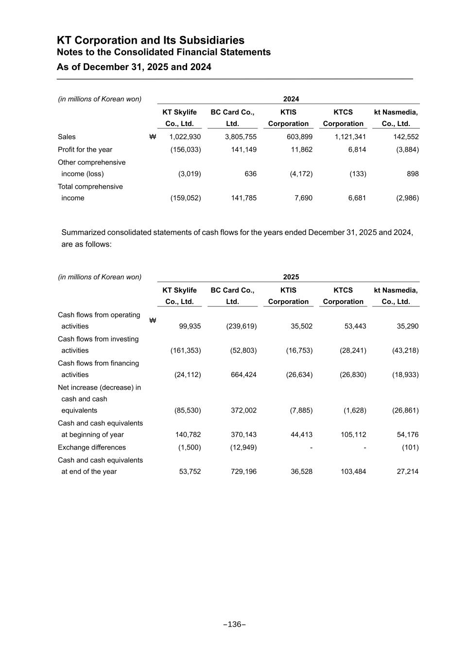 KT Corporation and Its Subsidiaries Notes to the Consolidated Financial Statements As of December 31, 2025 and 2024 (in millions of Korean won) 2024 KT Skylife Co., Ltd. BC Card Co., Ltd. KTIS Corporation KTCS Corporation kt Nasmedia, Co., Ltd. Sales ₩ 1,022,930 3,805,755 603,899 1,121,341 142,552 Profit for the year (156,033) 141,149 11,862 6,814 (3,884) Other comprehensive income (loss) (3,019) 636 (4,172) (133) 898 Total comprehensive income (159,052) 141,785 7,690 6,681 (2,986) Summarized consolidated statements of cash flows for the years ended December 31, 2025 and 2024, are as follows: (in millions of Korean won) 2025 KT Skylife Co., Ltd. BC Card Co., Ltd. KTIS Corporation KTCS Corporation kt Nasmedia, Co., Ltd. Cash flows from operating activities ₩ 99,935 (239,619) 35,502 53,443 35,290 Cash flows from investing activities (161,353) (52,803) (16,753) (28,241) (43,218) Cash flows from financing activities (24,112) 664,424 (26,634) (26,830) (18,933) Net increase (decrease) in cash and cash equivalents (85,530) 372,002 (7,885) (1,628) (26,861) Cash and cash equivalents at beginning of year 140,782 370,143 44,413 105,112 54,176 Exchange differences (1,500) (12,949) - - (101) Cash and cash equivalents at end of the year 53,752 729,196 36,528 103,484 27,214 -136-
