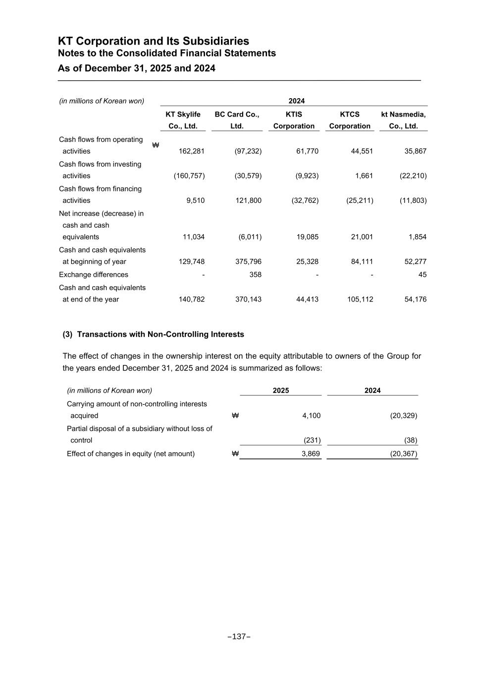 KT Corporation and Its Subsidiaries Notes to the Consolidated Financial Statements As of December 31, 2025 and 2024 (in millions of Korean won) 2024 KT Skylife Co., Ltd. BC Card Co., Ltd. KTIS Corporation KTCS Corporation kt Nasmedia, Co., Ltd. Cash flows from operating activities ₩ 162,281 (97,232) 61,770 44,551 35,867 Cash flows from investing activities (160,757) (30,579) (9,923) 1,661 (22,210) Cash flows from financing activities 9,510 121,800 (32,762) (25,211) (11,803) Net increase (decrease) in cash and cash equivalents 11,034 (6,011) 19,085 21,001 1,854 Cash and cash equivalents at beginning of year 129,748 375,796 25,328 84,111 52,277 Exchange differences - 358 - - 45 Cash and cash equivalents at end of the year 140,782 370,143 44,413 105,112 54,176 (3) Transactions with Non-Controlling Interests The effect of changes in the ownership interest on the equity attributable to owners of the Group for the years ended December 31, 2025 and 2024 is summarized as follows: (in millions of Korean won) 2025 2024 Carrying amount of non-controlling interests acquired ₩ 4,100 (20,329) Partial disposal of a subsidiary without loss of control (231) (38) Effect of changes in equity (net amount) ₩ 3,869 (20,367) -137-