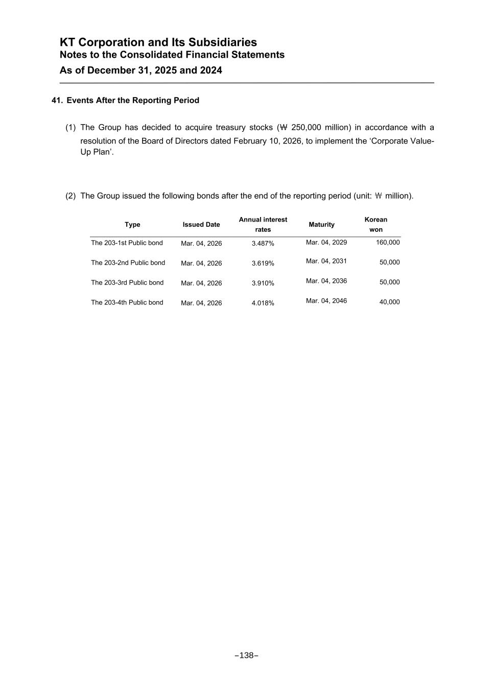 KT Corporation and Its Subsidiaries Notes to the Consolidated Financial Statements As of December 31, 2025 and 2024 41. Events After the Reporting Period (1) The Group has decided to acquire treasury stocks (₩ 250,000 million) in accordance with a resolution of the Board of Directors dated February 10, 2026, to implement the ‘Corporate Value- Up Plan’. (2) The Group issued the following bonds after the end of the reporting period (unit: \ million). Type Issued Date Annual interest rates Maturity Korean won The 203-1st Public bond Mar. 04, 2026 3.487% Mar. 04, 2029 160,000 The 203-2nd Public bond Mar. 04, 2026 3.619% Mar. 04, 2031 50,000 The 203-3rd Public bond Mar. 04, 2026 3.910% Mar. 04, 2036 50,000 The 203-4th Public bond Mar. 04, 2026 4.018% Mar. 04, 2046 40,000 -138-