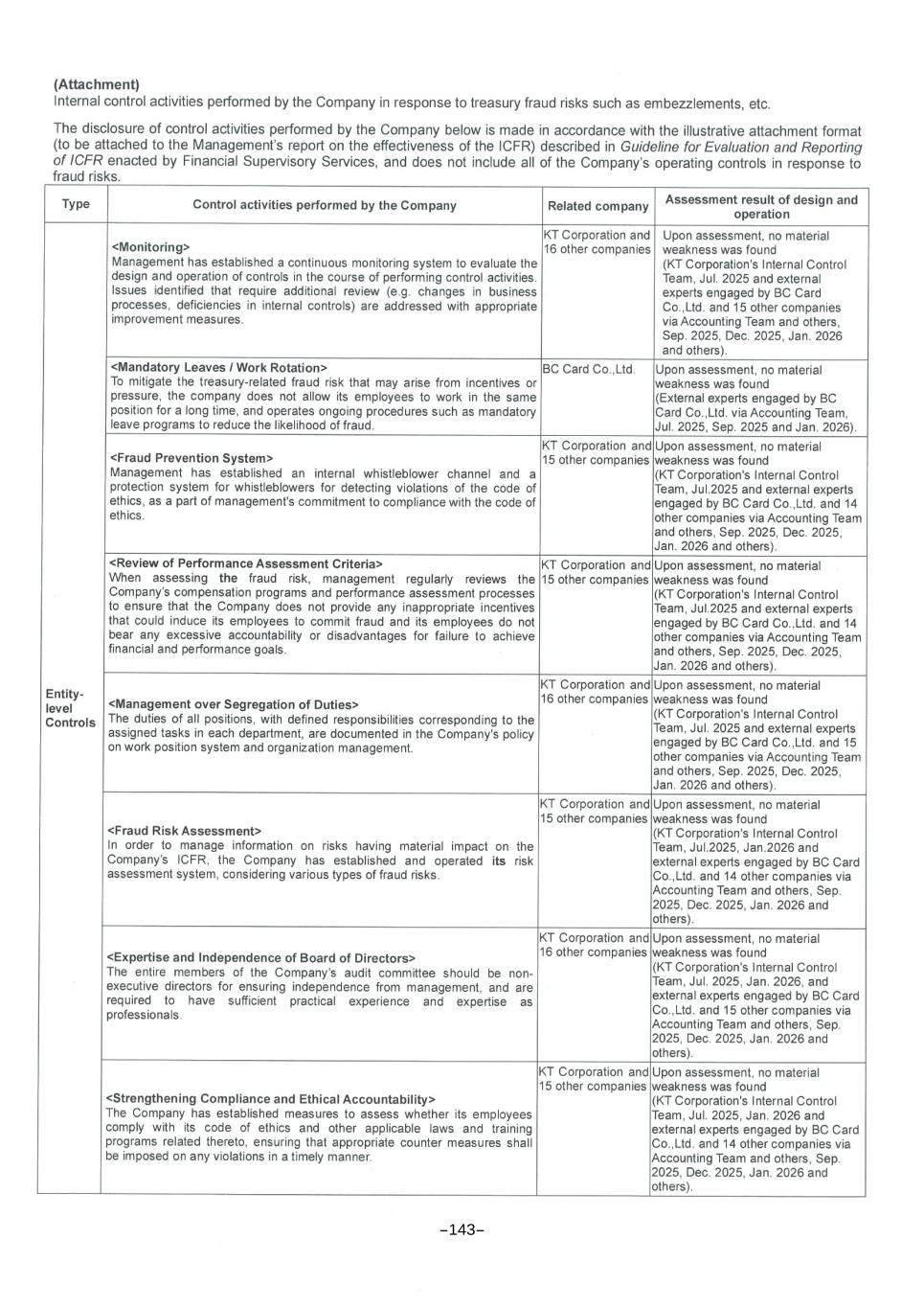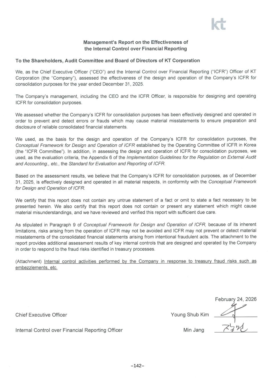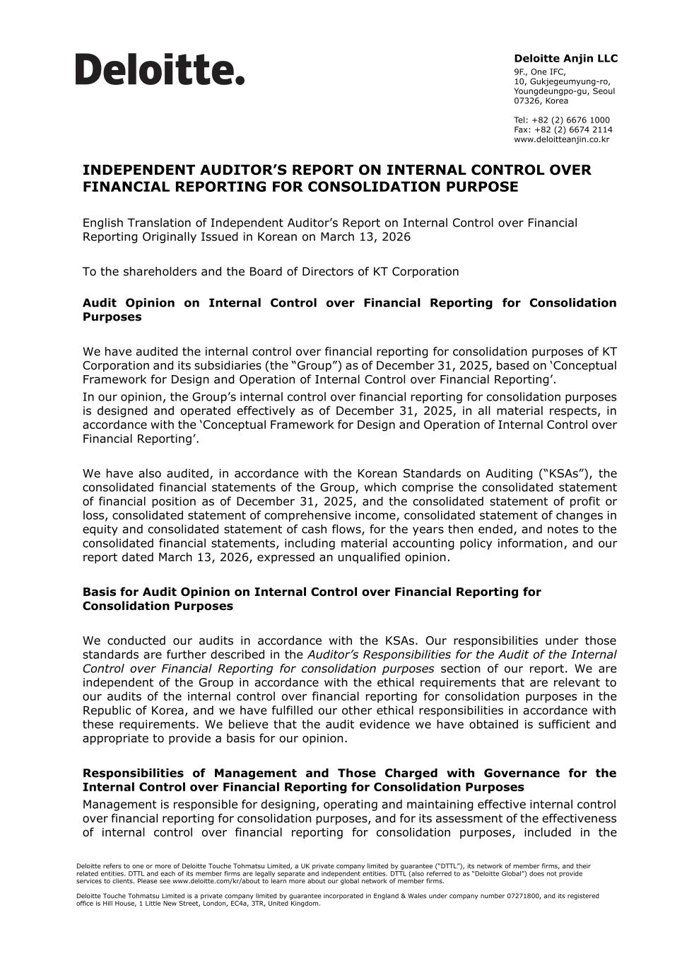 INDEPENDENT AUDITOR’S REPORT ON INTERNAL CONTROL OVER FINANCIAL REPORTING FOR CONSOLIDATION PURPOSE English Translation of Independent Auditor’s Report on Internal Control over Financial Reporting Originally Issued in Korean on March 13, 2026 To the shareholders and the Board of Directors of KT Corporation Audit Opinion on Internal Control over Financial Reporting for Consolidation Purposes We have audited the internal control over financial reporting for consolidation purposes of KT Corporation and its subsidiaries (the “Group”) as of December 31, 2025, based on ‘Conceptual Framework for Design and Operation of Internal Control over Financial Reporting’. In our opinion, the Group’s internal control over financial reporting for consolidation purposes is designed and operated effectively as of December 31, 2025, in all material respects, in accordance with the ‘Conceptual Framework for Design and Operation of Internal Control over Financial Reporting’. We have also audited, in accordance with the Korean Standards on Auditing (“KSAs”), the consolidated financial statements of the Group, which comprise the consolidated statement of financial position as of December 31, 2025, and the consolidated statement of profit or loss, consolidated statement of comprehensive income, consolidated statement of changes in equity and consolidated statement of cash flows, for the years then ended, and notes to the consolidated financial statements, including material accounting policy information, and our report dated March 13, 2026, expressed an unqualified opinion. Basis for Audit Opinion on Internal Control over Financial Reporting for Consolidation Purposes We conducted our audits in accordance with the KSAs. Our responsibilities under those standards are further described in the Auditor’s Responsibilities for the Audit of the Internal Control over Financial Reporting for consolidation purposes section of our report. We are independent of the Group in accordance with the ethical requirements that are relevant to our audits of the internal control over financial reporting for consolidation purposes in the Republic of Korea, and we have fulfilled our other ethical responsibilities in accordance with these requirements. We believe that the audit evidence we have obtained is sufficient and appropriate to provide a basis for our opinion. Responsibilities of Management and Those Charged with Governance for the Internal Control over Financial Reporting for Consolidation Purposes Management is responsible for designing, operating and maintaining effective internal control over financial reporting for consolidation purposes, and for its assessment of the effectiveness of internal control over financial reporting for consolidation purposes, included in the Deloitte Anjin LLC 9F., One IFC, 10, Gukjegeumyung-ro, Youngdeungpo-gu, Seoul 07326, Korea Tel: +82 (2) 6676 1000 Fax: +82 (2) 6674 2114 www.deloitteanjin.co.kr