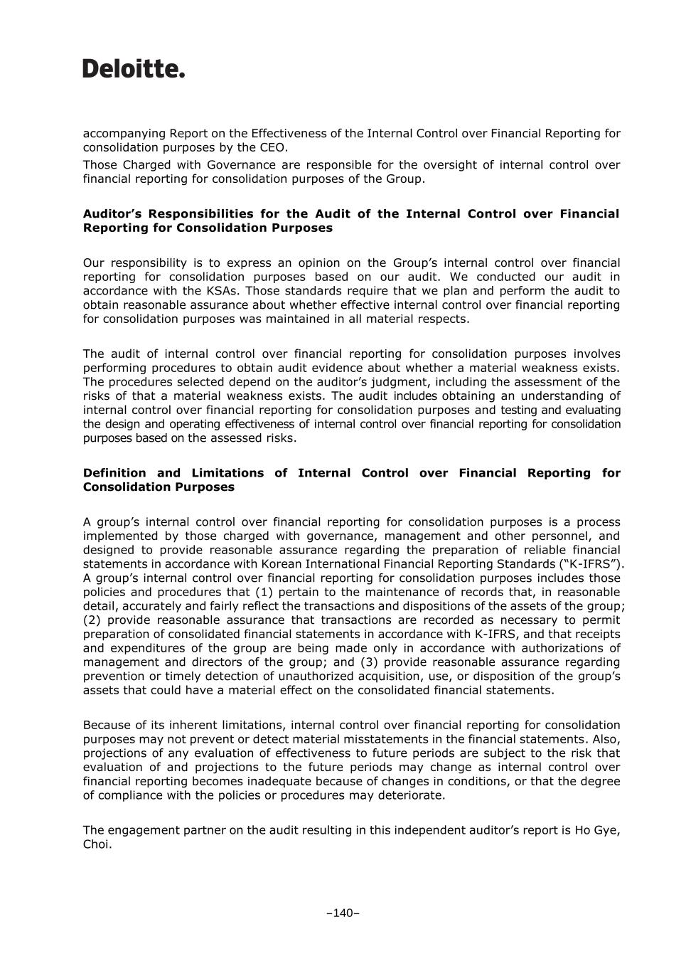 accompanying Report on the Effectiveness of the Internal Control over Financial Reporting for consolidation purposes by the CEO. Those Charged with Governance are responsible for the oversight of internal control over financial reporting for consolidation purposes of the Group. Auditor’s Responsibilities for the Audit of the Internal Control over Financial Reporting for Consolidation Purposes Our responsibility is to express an opinion on the Group’s internal control over financial reporting for consolidation purposes based on our audit. We conducted our audit in accordance with the KSAs. Those standards require that we plan and perform the audit to obtain reasonable assurance about whether effective internal control over financial reporting for consolidation purposes was maintained in all material respects. The audit of internal control over financial reporting for consolidation purposes involves performing procedures to obtain audit evidence about whether a material weakness exists. The procedures selected depend on the auditor’s judgment, including the assessment of the risks of that a material weakness exists. The audit includes obtaining an understanding of internal control over financial reporting for consolidation purposes and testing and evaluating the design and operating effectiveness of internal control over financial reporting for consolidation purposes based on the assessed risks. Definition and Limitations of Internal Control over Financial Reporting for Consolidation Purposes A group’s internal control over financial reporting for consolidation purposes is a process implemented by those charged with governance, management and other personnel, and designed to provide reasonable assurance regarding the preparation of reliable financial statements in accordance with Korean International Financial Reporting Standards (“K-IFRS”). A group’s internal control over financial reporting for consolidation purposes includes those policies and procedures that (1) pertain to the maintenance of records that, in reasonable detail, accurately and fairly reflect the transactions and dispositions of the assets of the group; (2) provide reasonable assurance that transactions are recorded as necessary to permit preparation of consolidated financial statements in accordance with K-IFRS, and that receipts and expenditures of the group are being made only in accordance with authorizations of management and directors of the group; and (3) provide reasonable assurance regarding prevention or timely detection of unauthorized acquisition, use, or disposition of the group’s assets that could have a material effect on the consolidated financial statements. Because of its inherent limitations, internal control over financial reporting for consolidation purposes may not prevent or detect material misstatements in the financial statements. Also, projections of any evaluation of effectiveness to future periods are subject to the risk that evaluation of and projections to the future periods may change as internal control over financial reporting becomes inadequate because of changes in conditions, or that the degree of compliance with the policies or procedures may deteriorate. The engagement partner on the audit resulting in this independent auditor’s report is Ho Gye, Choi. -140-