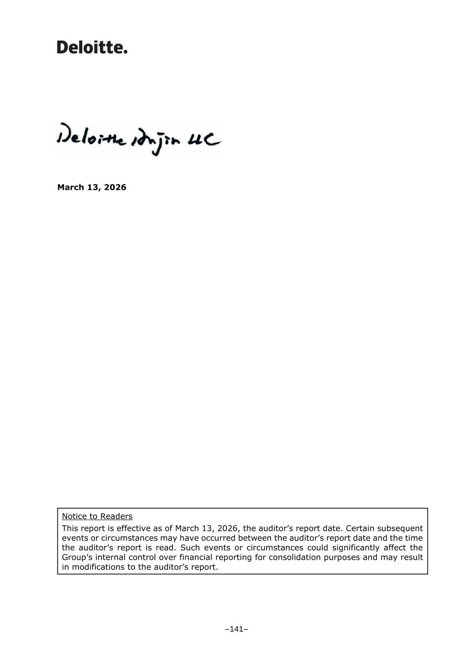 March 13, 2026 Notice to Readers This report is effective as of March 13, 2026, the auditor’s report date. Certain subsequent events or circumstances may have occurred between the auditor’s report date and the time the auditor’s report is read. Such events or circumstances could significantly affect the Group’s internal control over financial reporting for consolidation purposes and may result in modifications to the auditor’s report. -141-