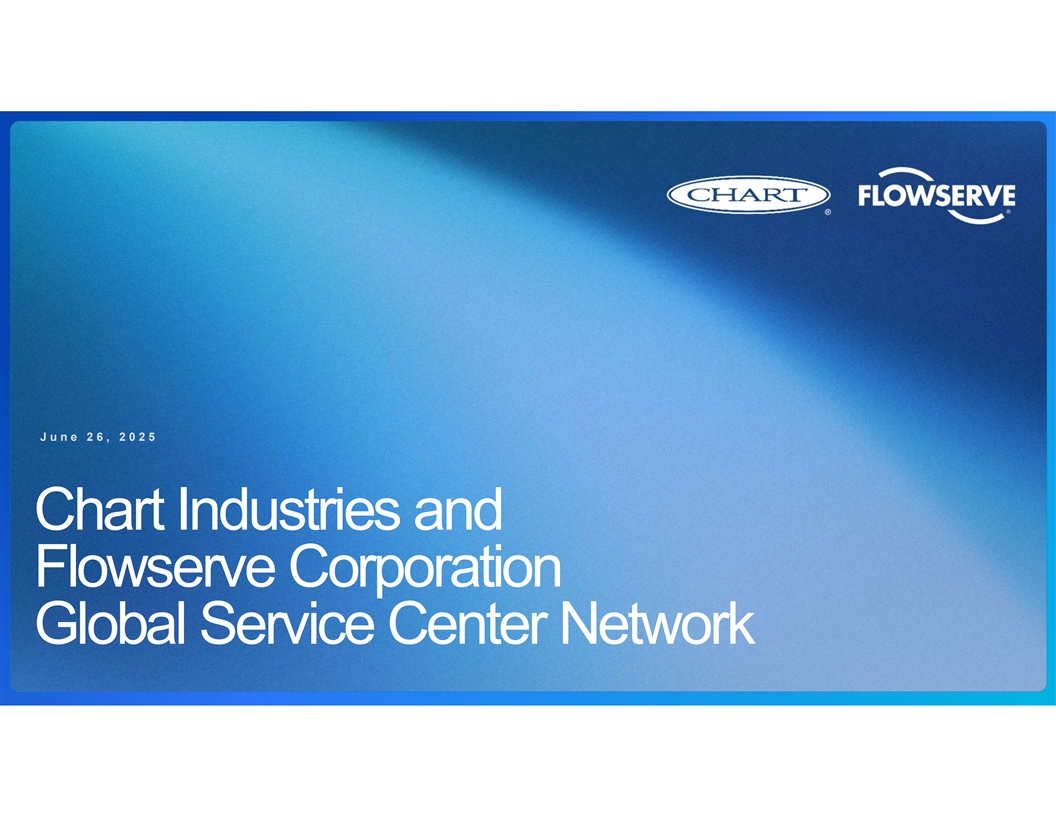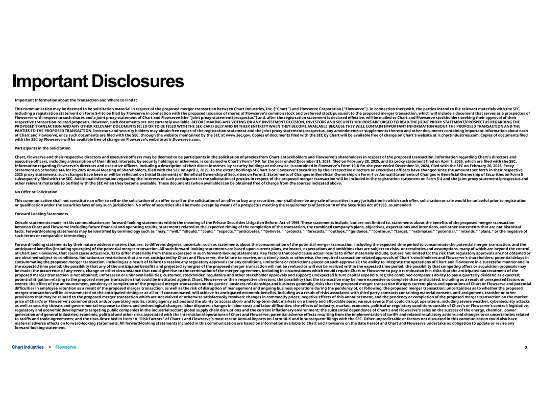 Important Disclosures Important Information about the Transaction and Where to Find It This communication may be deemed to be solicitation material in respect of the proposed merger transaction between Chart Industries, Inc. (“Chart”) and Flowserve Corporation (“Flowserve”). In connection therewith, the parties intend to file relevant materials with the SEC, including a registration statement on Form S-4 to be filed by Flowserve in connection with the proposed issuance of shares of Flowserve’s common stock and preferred stock pursuant to the proposed merger transaction, which will include a document that serves as a prospectus of Flowserve with respect to such shares and a joint proxy statement of Chart and Flowserve (the “joint proxy statement/prospectus”) and, after the registration statement is declared effective, will be mailed to Chart and Flowserve stockholders seeking their approval of their respective transaction-related proposals. However, such documents are not currently available. BEFORE MAKING ANY VOTING OR ANY INVESTMENT DECISION, INVESTORS AND SECURITY HOLDERS ARE URGED TO READ THE JOINT PROXY STATEMENT/PROSPECTUS REGARDING THE PROPOSED TRANSACTION AND ANY OTHER RELEVANT DOCUMENTS FILED OR TO BE FILED WITH THE SEC CAREFULLY AND IN THEIR ENTIRETY WHEN THEY BECOME AVAILABLE BECAUSE THEY WILL CONTAIN IMPORTANT INFORMATION ABOUT THE PROPOSED TRANSACTION AND THE PARTIES TO THE PROPOSED TRANSACTION. Investors and security holders may obtain free copies of the registration statement and the joint proxy statement/prospectus, any amendments or supplements thereto and other documents containing important information about each of Chart and Flowserve, once such documents are filed with the SEC, through the website maintained by the SEC at www.sec.gov. Copies of documents filed with the SEC by Chart will be available free of charge on Chart’s website at ir.chartindustries.com. Copies of documents filed with the SEC by Flowserve will be available free of charge on Flowserve’s website at ir.flowserve.com. Participants in the Solicitation Chart, Flowserve and their respective directors and executive officers may be deemed to be participants in the solicitation of proxies from Chart’s stockholders and Flowserve’s shareholders in respect of the proposed transaction. Information regarding Chart’s directors and executive officers, including a description of their direct interests, by security holdings or otherwise, is contained in Chart’s Form 10-K for the year ended December 31, 2024, filed on February 28, 2025, and its proxy statement filed on April 8, 2025, which are filed with the SEC. Information regarding Flowserve’s directors and executive officers, including a description of their direct interests, by security holdings or otherwise, is contained in Flowserve’s Form 10-K for the year ended December 31, 2024, filed with the SEC on February 26, 2025, Proxy Statement on Schedule 14A for its 2025 Annual Meeting of Shareholders, filed with the SEC on April 2, 2025. To the extent holdings of Chart’s or Flowserve’s securities by their respective directors or executives officers have changed since the amounts set forth in their respective 2025 proxy statements, such changes have been or will be reflected on Initial Statements of Beneficial Ownership of Securities on Form 3, Statements of Changes in Beneficial Ownership on Form 4 or Annual Statements of Changes in Beneficial Ownership of Securities on Form 5 subsequently filed with the SEC. Additional information regarding the interests of such participants in the solicitation of proxies in respect of the proposed merger transaction will be included in the registration statement on Form S-4 and the joint proxy statement/prospectus and other relevant materials to be filed with the SEC when they become available. These documents (when available) can be obtained free of charge from the sources indicated above. No Offer or Solicitation This communication shall not constitute an offer to sell or the solicitation of an offer to sell or the solicitation of an offer to buy any securities, nor shall there be any sale of securities in any jurisdiction in which such offer, solicitation or sale would be unlawful prior to registration or qualification under the securities laws of any such jurisdiction. No offer of securities shall be made except by means of a prospectus meeting the requirements of Section 10 of the Securities Act of 1933, as amended. Forward Looking Statements Certain statements made in this communication are forward-looking statements within the meaning of the Private Securities Litigation Reform Act of 1995. These statements include, but are not limited to, statements about the benefits of the proposed merger transaction between Chart and Flowserve including future financial and operating results, statements related to the expected timing of the completion of the transaction, the combined company’s plans, objectives, expectations and intentions, and other statements that are not historical facts. Forward-looking statements may be identified by terminology such as “may,” “will,” “should,” “could,” “expects,” “anticipates,” “believes,” “projects,” “forecasts,” “outlook,” “guidance,” “continue,” “target,” “estimates,” “potential,” “intends,” “plans,” or the negative of such terms or comparable terminology. Forward-looking statements by their nature address matters that are, to different degrees, uncertain, such as statements about the consummation of the potential merger transaction, including the expected time period to consummate the potential merger transaction, and the anticipated benefits (including synergies) of the potential merger transaction. All such forward-looking statements are based upon current plans, estimates, expectations and ambitions that are subject to risks, uncertainties and assumptions, many of which are beyond the 
