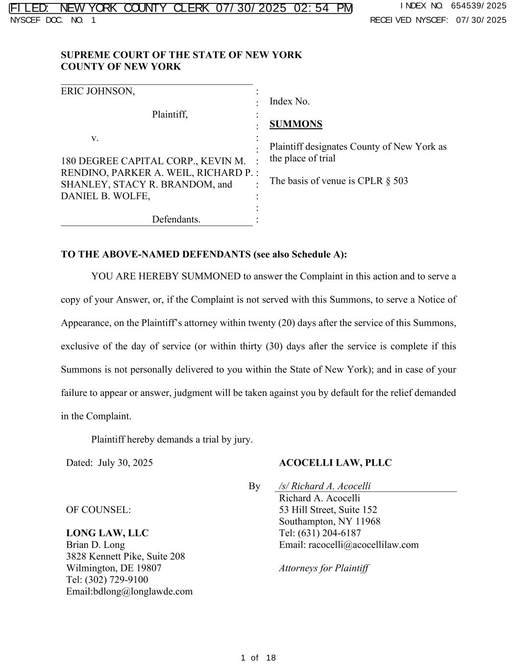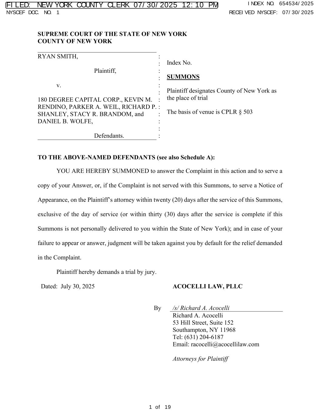 SUPREME COURT OF THE STATE OF NEW YORK COUNTY OF NEW YORK RYAN SMITH, Plaintiff, v. 180 DEGREE CAPITAL CORP., KEVIN M. RENDINO, PARKER A. WEIL, RICHARD P. SHANLEY, STACY R. BRANDOM, and DANIEL B. WOLFE, Defendants. : : : : : : : : : : : : Index No. SUMMONS Plaintiff designates County of New York as the place of trial The basis of venue is CPLR § 503 TO THE ABOVE-NAMED DEFENDANTS (see also Schedule A): YOU ARE HEREBY SUMMONED to answer the Complaint in this action and to serve a copy of your Answer, or, if the Complaint is not served with this Summons, to serve a Notice of Appearance, on the Plaintiff’s attorney within twenty (20) days after the service of this Summons, exclusive of the day of service (or within thirty (30) days after the service is complete if this Summons is not personally delivered to you within the State of New York); and in case of your failure to appear or answer, judgment will be taken against you by default for the relief demanded in the Complaint. Plaintiff hereby demands a trial by jury. Dated: July 30, 2025 By ACOCELLI LAW, PLLC /s/ Richard A. Acocelli Richard A. Acocelli 53 Hill Street, Suite 152 Southampton, NY 11968 Tel: (631) 204-6187 Email: racocelli@acocellilaw.com Attorneys for Plaintiff FILED: NEW YORK COUNTY CLERK 07/30/2025 12:10 PM INDEX NO. 654534/2025 NYSCEF DOC. NO. 1 RECEIVED NYSCEF: 07/30/2025 1 of 19