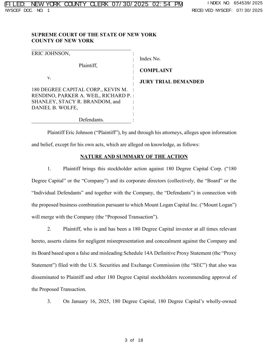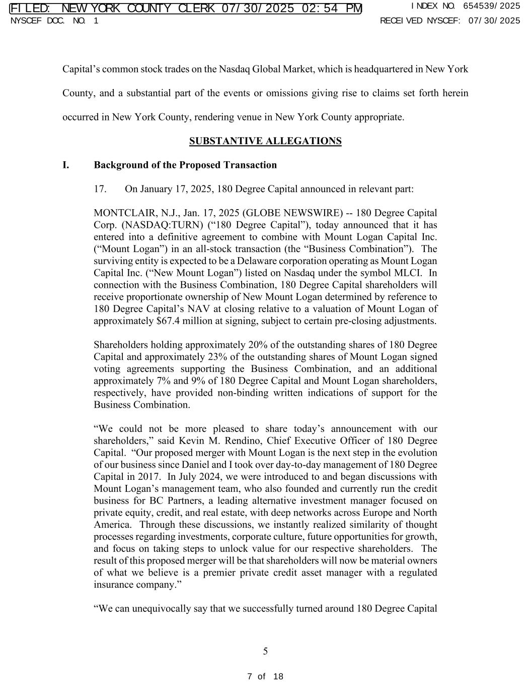 5 notions of fair play and substantial justice. 18. Venue is also proper in this Court pursuant to CPLR § 503 because 180 Degree Capital’s common stock trades on the Nasdaq Global Market, which is headquartered in New York County, and a substantial part of the events or omissions giving rise to claims set forth herein occurred in New York County, rendering venue in New York County appropriate. SUBSTANTIVE ALLEGATIONS I. Background and the Proposed Transaction 19. 180 Degree Capital is an internally managed investment company focused on generating capital appreciation and current income from investments in what the Company believes are deeply undervalued, small publicly traded companies where the Company believes it can positively impact the business and valuation through constructive activism. 20. On January 17, 2025, 180 Degree Capital issued a press release announcing the Proposed Transaction. The press release states, in relevant part: MONTCLAIR, N.J., Jan. 17, 2025 (GLOBE NEWSWIRE) -- 180 Degree Capital Corp. (NASDAQ:TURN) (“180 Degree Capital”), today announced that it has entered into a definitive agreement to combine with Mount Logan Capital Inc. (“Mount Logan”) in an all-stock transaction (the “Business Combination”). The surviving entity is expected to be a Delaware corporation operating as Mount Logan Capital Inc. (“New Mount Logan”) listed on Nasdaq under the symbol MLCI. In connection with the Business Combination, 180 Degree Capital shareholders will receive proportionate ownership of New Mount Logan determined by reference to 180 Degree Capital’s NAV at closing relative to a valuation of Mount Logan of approximately $67.4 million at signing, subject to certain pre-closing adjustments. Shareholders holding approximately 20% of the outstanding shares of 180 Degree Capital and approximately 23% of the outstanding shares of Mount Logan signed voting agreements supporting the Business Combination, and an additional approximately 7% and 9% of 180 Degree Capital and Mount Logan shareholders, respectively, have provided non-binding written indications of support for the Business Combination. “We could not be more pleased to share today’s announcement with our shareholders,” said Kevin M. Rendino, Chief Executive Officer of 180 Degree FILED: NEW YORK COUNTY CLERK 07/30/2025 12:10 PM INDEX NO. 654534/2025 NYSCEF DOC. NO. 1 RECEIVED NYSCEF: 07/30/2025 7 of 19