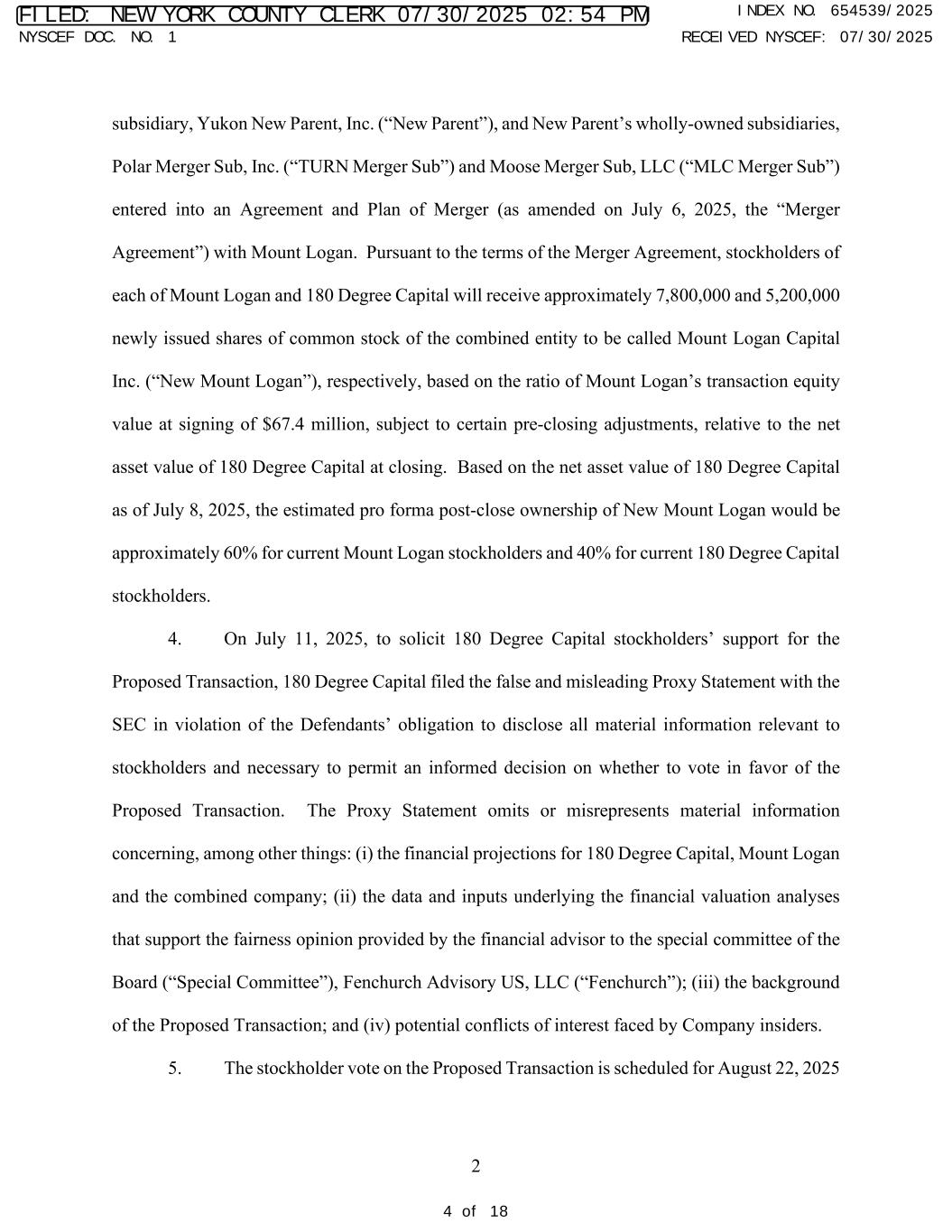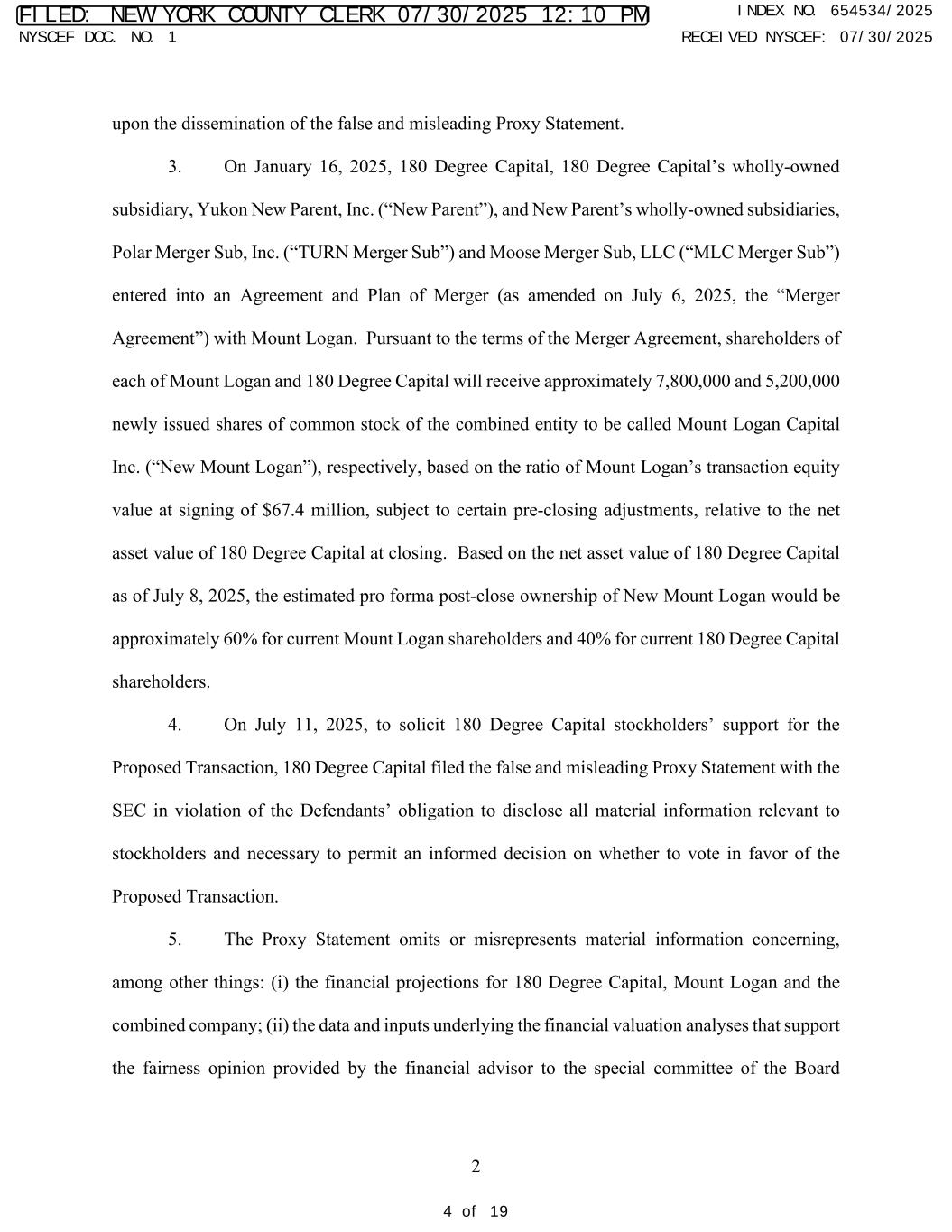 2 upon the dissemination of the false and misleading Proxy Statement. 3. On January 16, 2025, 180 Degree Capital, 180 Degree Capital’s wholly-owned subsidiary, Yukon New Parent, Inc. (“New Parent”), and New Parent’s wholly-owned subsidiaries, Polar Merger Sub, Inc. (“TURN Merger Sub”) and Moose Merger Sub, LLC (“MLC Merger Sub”) entered into an Agreement and Plan of Merger (as amended on July 6, 2025, the “Merger Agreement”) with Mount Logan. Pursuant to the terms of the Merger Agreement, shareholders of each of Mount Logan and 180 Degree Capital will receive approximately 7,800,000 and 5,200,000 newly issued shares of common stock of the combined entity to be called Mount Logan Capital Inc. (“New Mount Logan”), respectively, based on the ratio of Mount Logan’s transaction equity value at signing of $67.4 million, subject to certain pre-closing adjustments, relative to the net asset value of 180 Degree Capital at closing. Based on the net asset value of 180 Degree Capital as of July 8, 2025, the estimated pro forma post-close ownership of New Mount Logan would be approximately 60% for current Mount Logan shareholders and 40% for current 180 Degree Capital shareholders. 4. On July 11, 2025, to solicit 180 Degree Capital stockholders’ support for the Proposed Transaction, 180 Degree Capital filed the false and misleading Proxy Statement with the SEC in violation of the Defendants’ obligation to disclose all material information relevant to stockholders and necessary to permit an informed decision on whether to vote in favor of the Proposed Transaction. 5. The Proxy Statement omits or misrepresents material information concerning, among other things: (i) the financial projections for 180 Degree Capital, Mount Logan and the combined company; (ii) the data and inputs underlying the financial valuation analyses that support the fairness opinion provided by the financial advisor to the special committee of the Board FILED: NEW YORK COUNTY CLERK 07/30/2025 12:10 PM INDEX NO. 654534/2025 NYSCEF DOC. NO. 1 RECEIVED NYSCEF: 07/30/2025 4 of 19