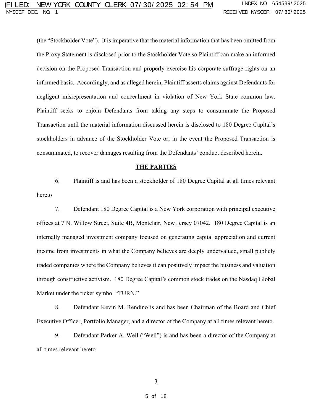 3 (“Special Committee”), Fenchurch Advisory US, LLC (“Fenchurch”); (iii) the background of the Proposed Transaction; and (iv) potential conflicts of interest faced by Company insiders. 6. The stockholder vote on the Proposed Transaction is scheduled for August 22, 2025 (the “Stockholder Vote”). It is imperative that the material information that has been omitted from the Proxy Statement is disclosed prior to the Stockholder Vote so Plaintiff can make an informed decision on the Proposed Transaction and properly exercise his corporate suffrage rights on an informed basis. 7. For these reasons, and as set forth in detail herein, Plaintiff asserts claims against Defendants for negligent misrepresentation and concealment in violation of New York State common law. Plaintiff seeks to enjoin Defendants from taking any steps to consummate the Proposed Transaction until the material information discussed herein is disclosed to 180 Degree Capital’s stockholders in advance of the Stockholder Vote or, in the event the Proposed Transaction is consummated, to recover damages resulting from the Defendants’ conduct described herein. THE PARTIES 8. Plaintiff is, and, at all times relevant hereto, was, a stockholder of 180 Degree Capital. 9. Defendant 180 Degree Capital is a New York corporation, with its principal executive offices located at 7 N. Willow Street, Suite 4B, Montclair, New Jersey 07042. 180 Degree Capital’s common stock trades on the Nasdaq Global Market under the ticker symbol “TURN.” 10. Defendant Kevin M. Rendino has been Chairman of the Board and Chief Executive Officer, Portfolio Manager, and a director of the Company at all relevant times. FILED: NEW YORK COUNTY CLERK 07/30/2025 12:10 PM INDEX NO. 654534/2025 NYSCEF DOC. NO. 1 RECEIVED NYSCEF: 07/30/2025 5 of 19