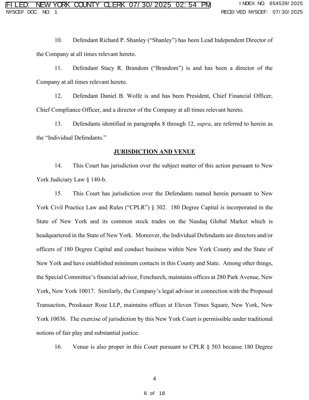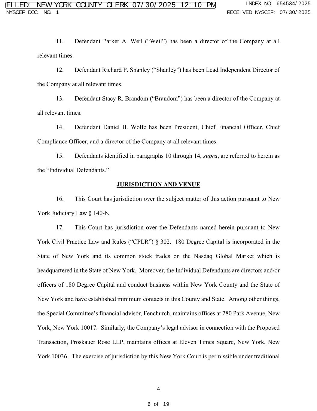 4 11. Defendant Parker A. Weil (“Weil”) has been a director of the Company at all relevant times. 12. Defendant Richard P. Shanley (“Shanley”) has been Lead Independent Director of the Company at all relevant times. 13. Defendant Stacy R. Brandom (“Brandom”) has been a director of the Company at all relevant times. 14. Defendant Daniel B. Wolfe has been President, Chief Financial Officer, Chief Compliance Officer, and a director of the Company at all relevant times. 15. Defendants identified in paragraphs 10 through 14, supra, are referred to herein as the “Individual Defendants.” JURISDICTION AND VENUE 16. This Court has jurisdiction over the subject matter of this action pursuant to New York Judiciary Law § 140-b. 17. This Court has jurisdiction over the Defendants named herein pursuant to New York Civil Practice Law and Rules (“CPLR”) § 302. 180 Degree Capital is incorporated in the State of New York and its common stock trades on the Nasdaq Global Market which is headquartered in the State of New York. Moreover, the Individual Defendants are directors and/or officers of 180 Degree Capital and conduct business within New York County and the State of New York and have established minimum contacts in this County and State. Among other things, the Special Committee’s financial advisor, Fenchurch, maintains offices at 280 Park Avenue, New York, New York 10017. Similarly, the Company’s legal advisor in connection with the Proposed Transaction, Proskauer Rose LLP, maintains offices at Eleven Times Square, New York, New York 10036. The exercise of jurisdiction by this New York Court is permissible under traditional FILED: NEW YORK COUNTY CLERK 07/30/2025 12:10 PM INDEX NO. 654534/2025 NYSCEF DOC. NO. 1 RECEIVED NYSCEF: 07/30/2025 6 of 19
