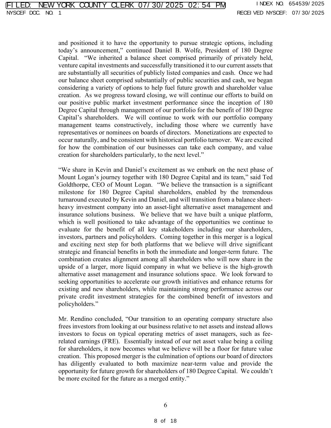 6 Capital. “Our proposed merger with Mount Logan is the next step in the evolution of our business since Daniel and I took over day-to-day management of 180 Degree Capital in 2017. In July 2024, we were introduced to and began discussions with Mount Logan’s management team, who also founded and currently run the credit business for BC Partners, a leading alternative investment manager focused on private equity, credit, and real estate, with deep networks across Europe and North America. Through these discussions, we instantly realized similarity of thought processes regarding investments, corporate culture, future opportunities for growth, and focus on taking steps to unlock value for our respective shareholders. The result of this proposed merger will be that shareholders will now be material owners of what we believe is a premier private credit asset manager with a regulated insurance company.” “We can unequivocally say that we successfully turned around 180 Degree Capital and positioned it to have the opportunity to pursue strategic options, including today’s announcement,” continued Daniel B. Wolfe, President of 180 Degree Capital. “We inherited a balance sheet comprised primarily of privately held, venture capital investments and successfully transitioned it to our current assets that are substantially all securities of publicly listed companies and cash. Once we had our balance sheet comprised substantially of public securities and cash, we began considering a variety of options to help fuel future growth and shareholder value creation. As we progress toward closing, we will continue our efforts to build on our positive public market investment performance since the inception of 180 Degree Capital through management of our portfolio for the benefit of 180 Degree Capital’s shareholders. We will continue to work with our portfolio company management teams constructively, including those where we currently have representatives or nominees on boards of directors. Monetizations are expected to occur naturally, and be consistent with historical portfolio turnover. We are excited for how the combination of our businesses can take each company, and value creation for shareholders particularly, to the next level.” “We share in Kevin and Daniel’s excitement as we embark on the next phase of Mount Logan’s journey together with 180 Degree Capital and its team,” said Ted Goldthorpe, CEO of Mount Logan. “We believe the transaction is a significant milestone for 180 Degree Capital shareholders, enabled by the tremendous turnaround executed by Kevin and Daniel, and will transition from a balance sheet- heavy investment company into an asset-light alternative asset management and insurance solutions business. We believe that we have built a unique platform, which is well positioned to take advantage of the opportunities we continue to evaluate for the benefit of all key stakeholders including our shareholders, investors, partners and policyholders. Coming together in this merger is a logical and exciting next step for both platforms that we believe will drive significant strategic and financial benefits in both the immediate and longer-term future. The combination creates alignment among all shareholders who will now share in the upside of a larger, more liquid company in what we believe is the high-growth alternative asset management and insurance solutions space. We look forward to FILED: NEW YORK COUNTY CLERK 07/30/2025 12:10 PM INDEX NO. 654534/2025 NYSCEF DOC. NO. 1 RECEIVED NYSCEF: 07/30/2025 8 of 19