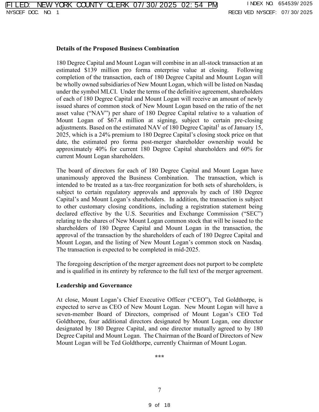 7 seeking opportunities to accelerate our growth initiatives and enhance returns for existing and new shareholders, while maintaining strong performance across our private credit investment strategies for the combined benefit of investors and policyholders.” Mr. Rendino concluded, “Our transition to an operating company structure also frees investors from looking at our business relative to net assets and instead allows investors to focus on typical operating metrics of asset managers, such as fee- related earnings (FRE). Essentially instead of our net asset value being a ceiling for shareholders, it now becomes what we believe will be a floor for future value creation. This proposed merger is the culmination of options our board of directors has diligently evaluated to both maximize near-term value and provide the opportunity for future growth for shareholders of 180 Degree Capital. We couldn’t be more excited for the future as a merged entity.” Details of the Proposed Business Combination 180 Degree Capital and Mount Logan will combine in an all-stock transaction at an estimated $139 million pro forma enterprise value at closing. Following completion of the transaction, each of 180 Degree Capital and Mount Logan will be wholly owned subsidiaries of New Mount Logan, which will be listed on Nasdaq under the symbol MLCI. Under the terms of the definitive agreement, shareholders of each of 180 Degree Capital and Mount Logan will receive an amount of newly issued shares of common stock of New Mount Logan based on the ratio of the net asset value (“NAV”) per share of 180 Degree Capital relative to a valuation of Mount Logan of $67.4 million at signing, subject to certain pre-closing adjustments. Based on the estimated NAV of 180 Degree Capital1 as of January 15, 2025, which is a 24% premium to 180 Degree Capital’s closing stock price on that date, the estimated pro forma post-merger shareholder ownership would be approximately 40% for current 180 Degree Capital shareholders and 60% for current Mount Logan shareholders. The board of directors for each of 180 Degree Capital and Mount Logan have unanimously approved the Business Combination. The transaction, which is intended to be treated as a tax-free reorganization for both sets of shareholders, is subject to certain regulatory approvals and approvals by each of 180 Degree Capital’s and Mount Logan’s shareholders. In addition, the transaction is subject to other customary closing conditions, including a registration statement being declared effective by the U.S. Securities and Exchange Commission (“SEC”) relating to the shares of New Mount Logan common stock that will be issued to the shareholders of 180 Degree Capital and Mount Logan in the transaction, the approval of the transaction by the shareholders of each of 180 Degree Capital and Mount Logan, and the listing of New Mount Logan’s common stock on Nasdaq. The transaction is expected to be completed in mid-2025. The foregoing description of the merger agreement does not purport to be complete FILED: NEW YORK COUNTY CLERK 07/30/2025 12:10 PM INDEX NO. 654534/2025 NYSCEF DOC. NO. 1 RECEIVED NYSCEF: 07/30/2025 9 of 19