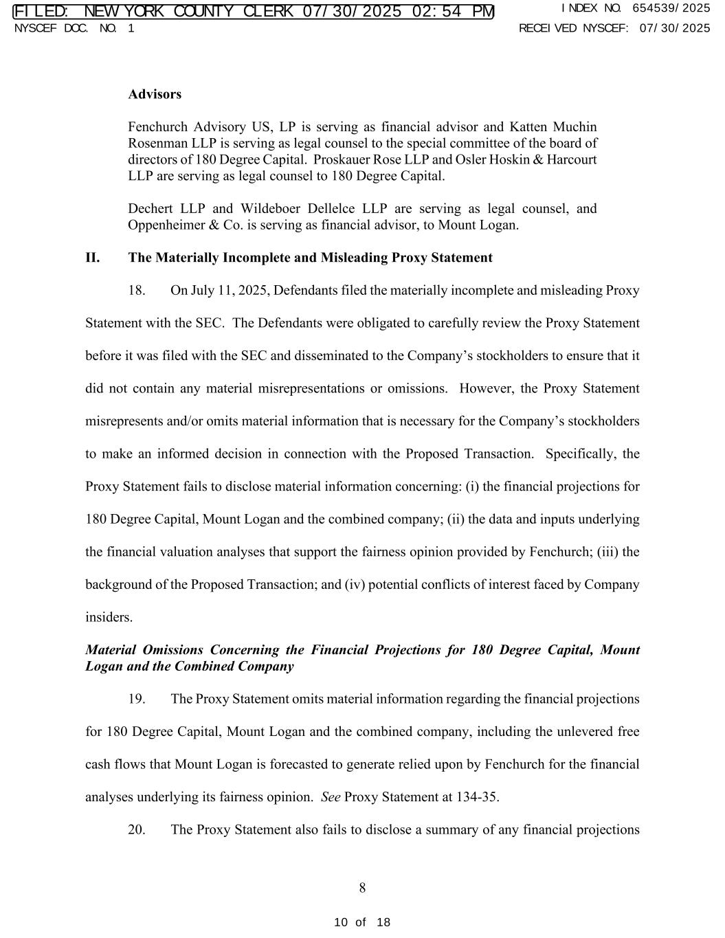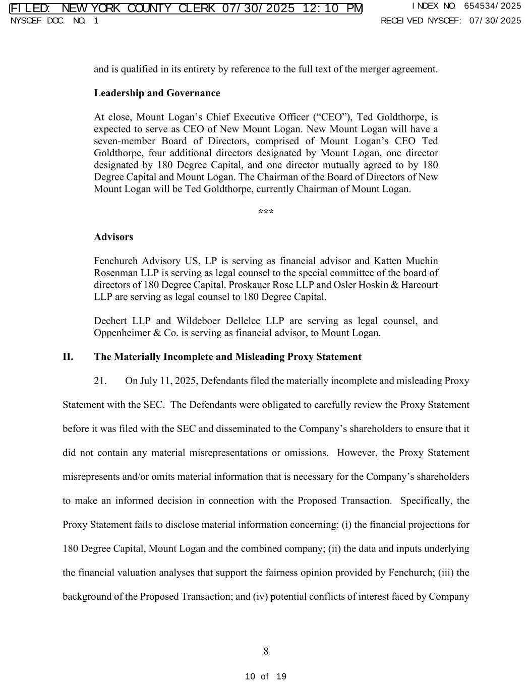 8 and is qualified in its entirety by reference to the full text of the merger agreement. Leadership and Governance At close, Mount Logan’s Chief Executive Officer (“CEO”), Ted Goldthorpe, is expected to serve as CEO of New Mount Logan. New Mount Logan will have a seven-member Board of Directors, comprised of Mount Logan’s CEO Ted Goldthorpe, four additional directors designated by Mount Logan, one director designated by 180 Degree Capital, and one director mutually agreed to by 180 Degree Capital and Mount Logan. The Chairman of the Board of Directors of New Mount Logan will be Ted Goldthorpe, currently Chairman of Mount Logan. *** Advisors Fenchurch Advisory US, LP is serving as financial advisor and Katten Muchin Rosenman LLP is serving as legal counsel to the special committee of the board of directors of 180 Degree Capital. Proskauer Rose LLP and Osler Hoskin & Harcourt LLP are serving as legal counsel to 180 Degree Capital. Dechert LLP and Wildeboer Dellelce LLP are serving as legal counsel, and Oppenheimer & Co. is serving as financial advisor, to Mount Logan. II. The Materially Incomplete and Misleading Proxy Statement 21. On July 11, 2025, Defendants filed the materially incomplete and misleading Proxy Statement with the SEC. The Defendants were obligated to carefully review the Proxy Statement before it was filed with the SEC and disseminated to the Company’s shareholders to ensure that it did not contain any material misrepresentations or omissions. However, the Proxy Statement misrepresents and/or omits material information that is necessary for the Company’s shareholders to make an informed decision in connection with the Proposed Transaction. Specifically, the Proxy Statement fails to disclose material information concerning: (i) the financial projections for 180 Degree Capital, Mount Logan and the combined company; (ii) the data and inputs underlying the financial valuation analyses that support the fairness opinion provided by Fenchurch; (iii) the background of the Proposed Transaction; and (iv) potential conflicts of interest faced by Company FILED: NEW YORK COUNTY CLERK 07/30/2025 12:10 PM INDEX NO. 654534/2025 NYSCEF DOC. NO. 1 RECEIVED NYSCEF: 07/30/2025 10 of 19