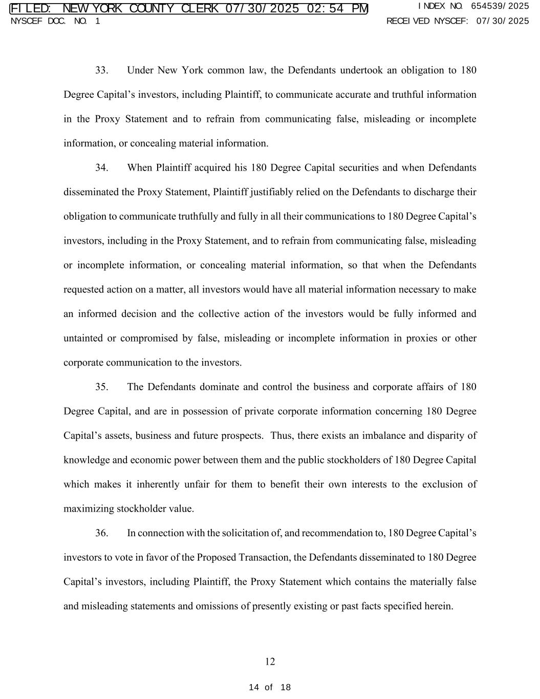 13 FIRST CAUSE OF ACTION Claim for Negligent Misrepresentation and Concealment in Violation of New York Common Law Against the Defendants 39. Plaintiff incorporates by reference and realleges each and every allegation contained above, as though fully set forth herein. 40. Under New York common law, the Defendants undertook an obligation to 180 Degree Capital’s investors, including Plaintiff, to communicate accurate and truthful information in the Proxy Statement and to refrain from communicating false, misleading or incomplete information, or concealing material information. 41. When Plaintiff acquired his 180 Degree Capital securities and when Defendants disseminated the Proxy Statement, Plaintiff justifiably relied on the Defendants to discharge their obligation to communicate truthfully and fully in all their communications to 180 Degree Capital’s investors, including in the Proxy Statement, and to refrain from communicating false, misleading or incomplete information, or concealing material information, so that when the Defendants requested action on a matter, all investors would have all material information necessary to make an informed decision and the collective action of the investors would be fully informed and untainted or compromised by false, misleading or incomplete information in proxies or other corporate communication to the investors. 42. The Defendants dominate and control the business and corporate affairs of 180 Degree Capital, and are in possession of private corporate information concerning 180 Degree Capital’s assets, business and future prospects. Thus, there exists an imbalance and disparity of knowledge and economic power between them and the public shareholders of 180 Degree Capital which makes it inherently unfair for them to benefit their own interests to the exclusion of maximizing shareholder value. FILED: NEW YORK COUNTY CLERK 07/30/2025 12:10 PM INDEX NO. 654534/2025 NYSCEF DOC. NO. 1 RECEIVED NYSCEF: 07/30/2025 15 of 19