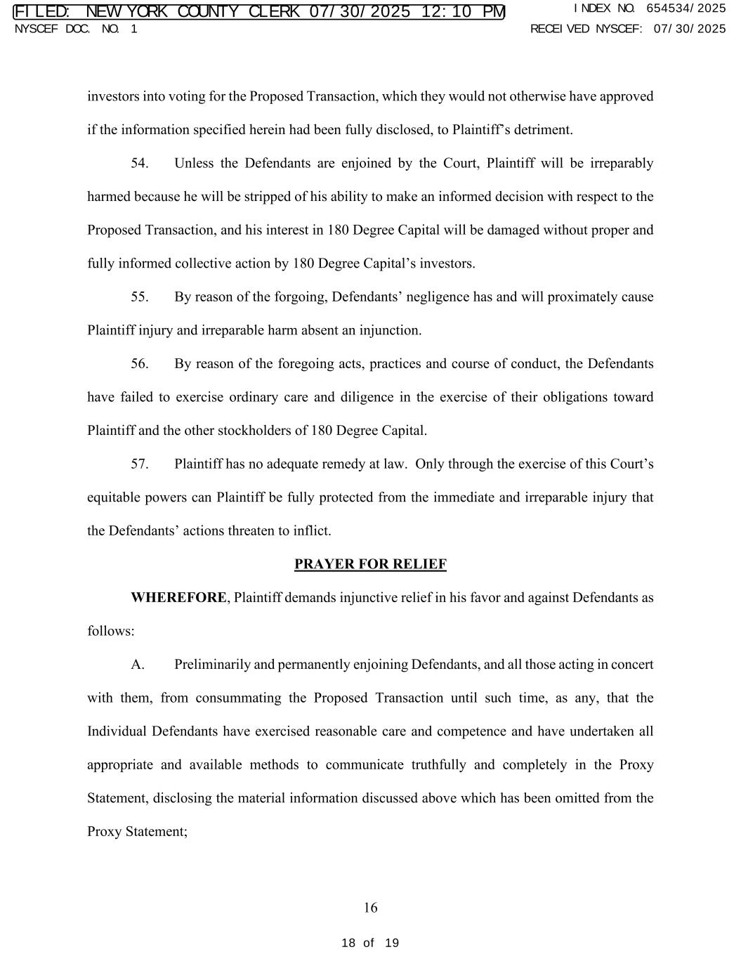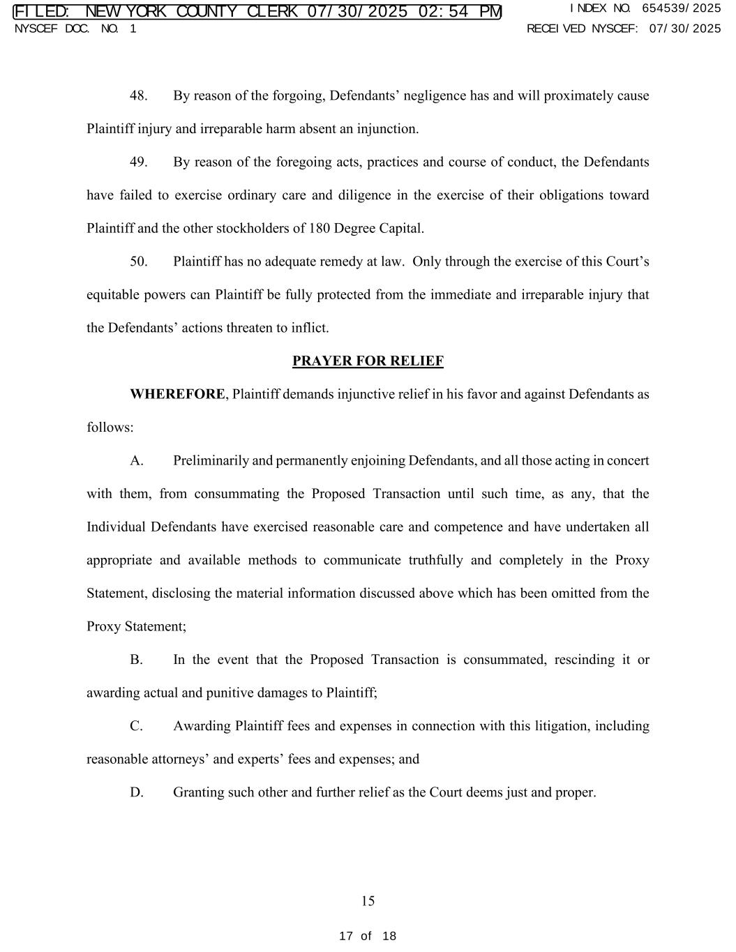 16 investors into voting for the Proposed Transaction, which they would not otherwise have approved if the information specified herein had been fully disclosed, to Plaintiff’s detriment. 54. Unless the Defendants are enjoined by the Court, Plaintiff will be irreparably harmed because he will be stripped of his ability to make an informed decision with respect to the Proposed Transaction, and his interest in 180 Degree Capital will be damaged without proper and fully informed collective action by 180 Degree Capital’s investors. 55. By reason of the forgoing, Defendants’ negligence has and will proximately cause Plaintiff injury and irreparable harm absent an injunction. 56. By reason of the foregoing acts, practices and course of conduct, the Defendants have failed to exercise ordinary care and diligence in the exercise of their obligations toward Plaintiff and the other stockholders of 180 Degree Capital. 57. Plaintiff has no adequate remedy at law. Only through the exercise of this Court’s equitable powers can Plaintiff be fully protected from the immediate and irreparable injury that the Defendants’ actions threaten to inflict. PRAYER FOR RELIEF WHEREFORE, Plaintiff demands injunctive relief in his favor and against Defendants as follows: A. Preliminarily and permanently enjoining Defendants, and all those acting in concert with them, from consummating the Proposed Transaction until such time, as any, that the Individual Defendants have exercised reasonable care and competence and have undertaken all appropriate and available methods to communicate truthfully and completely in the Proxy Statement, disclosing the material information discussed above which has been omitted from the Proxy Statement; FILED: NEW YORK COUNTY CLERK 07/30/2025 12:10 PM INDEX NO. 654534/2025 NYSCEF DOC. NO. 1 RECEIVED NYSCEF: 07/30/2025 18 of 19