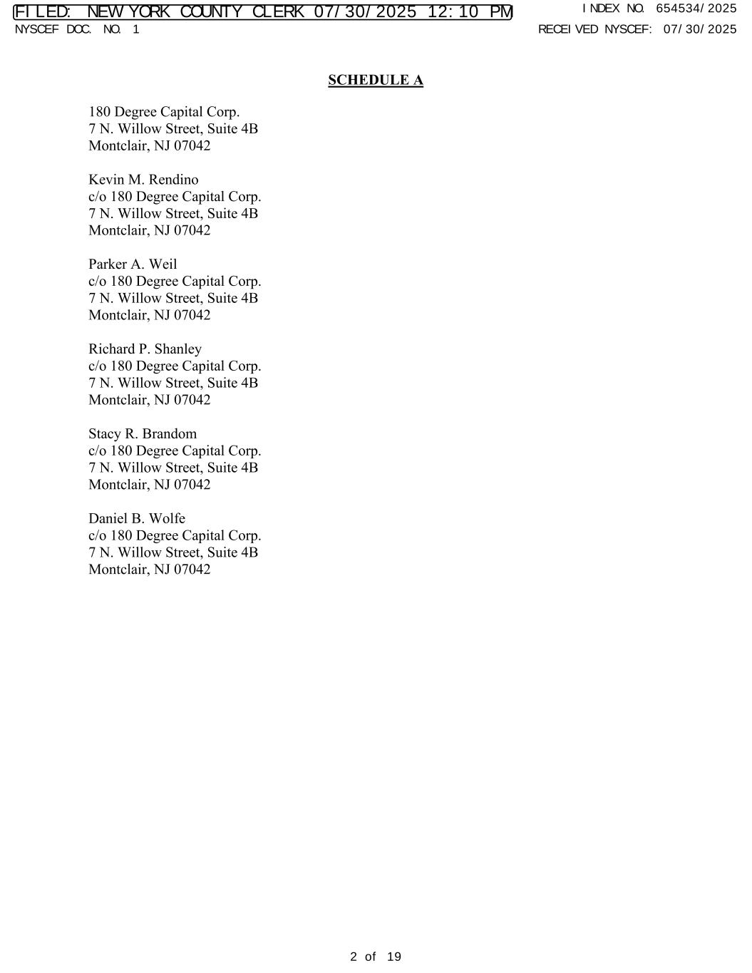SCHEDULE A 180 Degree Capital Corp. 7 N. Willow Street, Suite 4B Montclair, NJ 07042 Kevin M. Rendino c/o 180 Degree Capital Corp. 7 N. Willow Street, Suite 4B Montclair, NJ 07042 Parker A. Weil c/o 180 Degree Capital Corp. 7 N. Willow Street, Suite 4B Montclair, NJ 07042 Richard P. Shanley c/o 180 Degree Capital Corp. 7 N. Willow Street, Suite 4B Montclair, NJ 07042 Stacy R. Brandom c/o 180 Degree Capital Corp. 7 N. Willow Street, Suite 4B Montclair, NJ 07042 Daniel B. Wolfe c/o 180 Degree Capital Corp. 7 N. Willow Street, Suite 4B Montclair, NJ 07042 FILED: NEW YORK COUNTY CLERK 07/30/2025 12:10 PM INDEX NO. 654534/2025 NYSCEF DOC. NO. 1 RECEIVED NYSCEF: 07/30/2025 2 of 19