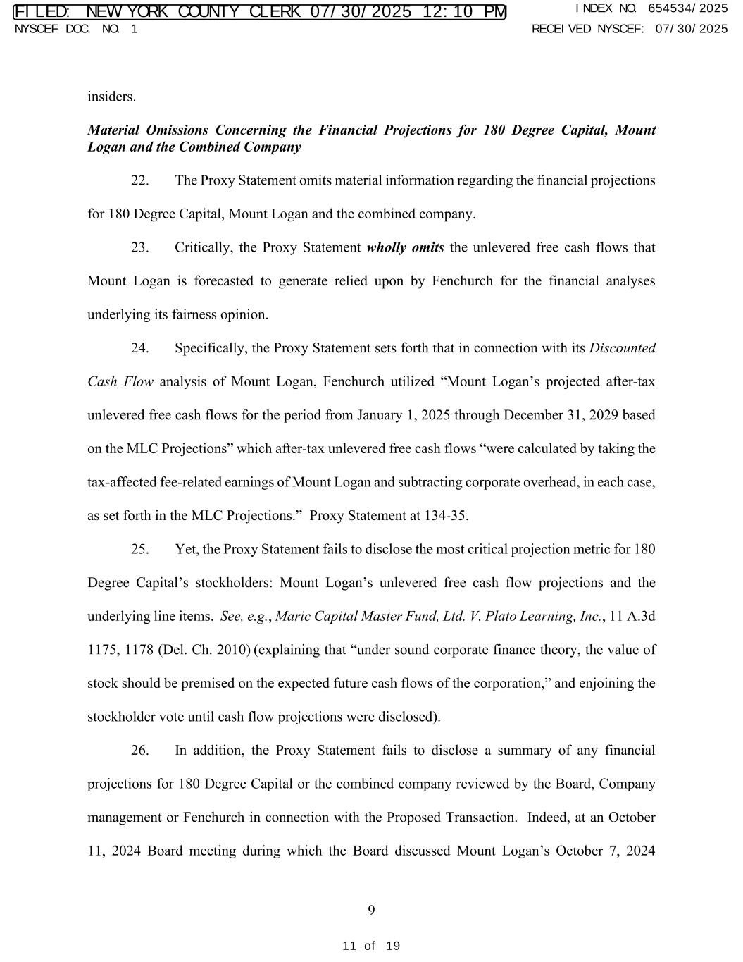 9 insiders. Material Omissions Concerning the Financial Projections for 180 Degree Capital, Mount Logan and the Combined Company 22. The Proxy Statement omits material information regarding the financial projections for 180 Degree Capital, Mount Logan and the combined company. 23. Critically, the Proxy Statement wholly omits the unlevered free cash flows that Mount Logan is forecasted to generate relied upon by Fenchurch for the financial analyses underlying its fairness opinion. 24. Specifically, the Proxy Statement sets forth that in connection with its Discounted Cash Flow analysis of Mount Logan, Fenchurch utilized “Mount Logan’s projected after-tax unlevered free cash flows for the period from January 1, 2025 through December 31, 2029 based on the MLC Projections” which after-tax unlevered free cash flows “were calculated by taking the tax-affected fee-related earnings of Mount Logan and subtracting corporate overhead, in each case, as set forth in the MLC Projections.” Proxy Statement at 134-35. 25. Yet, the Proxy Statement fails to disclose the most critical projection metric for 180 Degree Capital’s stockholders: Mount Logan’s unlevered free cash flow projections and the underlying line items. See, e.g., Maric Capital Master Fund, Ltd. V. Plato Learning, Inc., 11 A.3d 1175, 1178 (Del. Ch. 2010) (explaining that “under sound corporate finance theory, the value of stock should be premised on the expected future cash flows of the corporation,” and enjoining the stockholder vote until cash flow projections were disclosed). 26. In addition, the Proxy Statement fails to disclose a summary of any financial projections for 180 Degree Capital or the combined company reviewed by the Board, Company management or Fenchurch in connection with the Proposed Transaction. Indeed, at an October 11, 2024 Board meeting during which the Board discussed Mount Logan’s October 7, 2024 FILED: NEW YORK COUNTY CLERK 07/30/2025 12:10 PM INDEX NO. 654534/2025 NYSCEF DOC. NO. 1 RECEIVED NYSCEF: 07/30/2025 11 of 19