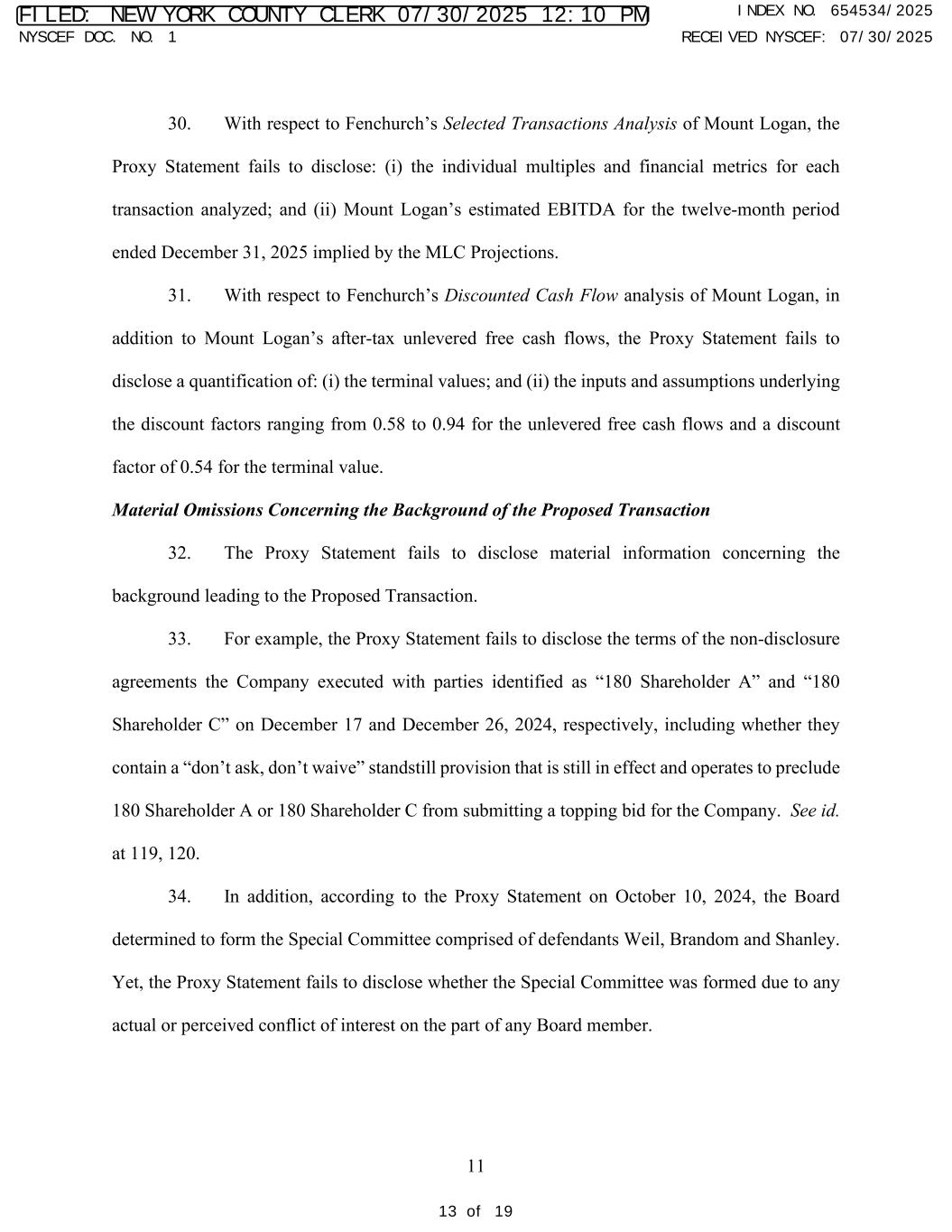 11 30. With respect to Fenchurch’s Selected Transactions Analysis of Mount Logan, the Proxy Statement fails to disclose: (i) the individual multiples and financial metrics for each transaction analyzed; and (ii) Mount Logan’s estimated EBITDA for the twelve-month period ended December 31, 2025 implied by the MLC Projections. 31. With respect to Fenchurch’s Discounted Cash Flow analysis of Mount Logan, in addition to Mount Logan’s after-tax unlevered free cash flows, the Proxy Statement fails to disclose a quantification of: (i) the terminal values; and (ii) the inputs and assumptions underlying the discount factors ranging from 0.58 to 0.94 for the unlevered free cash flows and a discount factor of 0.54 for the terminal value. Material Omissions Concerning the Background of the Proposed Transaction 32. The Proxy Statement fails to disclose material information concerning the background leading to the Proposed Transaction. 33. For example, the Proxy Statement fails to disclose the terms of the non-disclosure agreements the Company executed with parties identified as “180 Shareholder A” and “180 Shareholder C” on December 17 and December 26, 2024, respectively, including whether they contain a “don’t ask, don’t waive” standstill provision that is still in effect and operates to preclude 180 Shareholder A or 180 Shareholder C from submitting a topping bid for the Company. See id. at 119, 120. 34. In addition, according to the Proxy Statement on October 10, 2024, the Board determined to form the Special Committee comprised of defendants Weil, Brandom and Shanley. Yet, the Proxy Statement fails to disclose whether the Special Committee was formed due to any actual or perceived conflict of interest on the part of any Board member. FILED: NEW YORK COUNTY CLERK 07/30/2025 12:10 PM INDEX NO. 654534/2025 NYSCEF DOC. NO. 1 RECEIVED NYSCEF: 07/30/2025 13 of 19