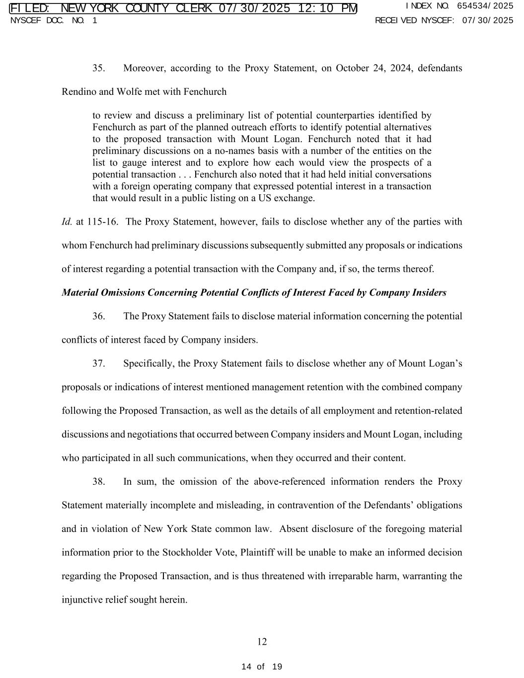 12 35. Moreover, according to the Proxy Statement, on October 24, 2024, defendants Rendino and Wolfe met with Fenchurch to review and discuss a preliminary list of potential counterparties identified by Fenchurch as part of the planned outreach efforts to identify potential alternatives to the proposed transaction with Mount Logan. Fenchurch noted that it had preliminary discussions on a no-names basis with a number of the entities on the list to gauge interest and to explore how each would view the prospects of a potential transaction . . . Fenchurch also noted that it had held initial conversations with a foreign operating company that expressed potential interest in a transaction that would result in a public listing on a US exchange. Id. at 115-16. The Proxy Statement, however, fails to disclose whether any of the parties with whom Fenchurch had preliminary discussions subsequently submitted any proposals or indications of interest regarding a potential transaction with the Company and, if so, the terms thereof. Material Omissions Concerning Potential Conflicts of Interest Faced by Company Insiders 36. The Proxy Statement fails to disclose material information concerning the potential conflicts of interest faced by Company insiders. 37. Specifically, the Proxy Statement fails to disclose whether any of Mount Logan’s proposals or indications of interest mentioned management retention with the combined company following the Proposed Transaction, as well as the details of all employment and retention-related discussions and negotiations that occurred between Company insiders and Mount Logan, including who participated in all such communications, when they occurred and their content. 38. In sum, the omission of the above-referenced information renders the Proxy Statement materially incomplete and misleading, in contravention of the Defendants’ obligations and in violation of New York State common law. Absent disclosure of the foregoing material information prior to the Stockholder Vote, Plaintiff will be unable to make an informed decision regarding the Proposed Transaction, and is thus threatened with irreparable harm, warranting the injunctive relief sought herein. FILED: NEW YORK COUNTY CLERK 07/30/2025 12:10 PM INDEX NO. 654534/2025 NYSCEF DOC. NO. 1 RECEIVED NYSCEF: 07/30/2025 14 of 19