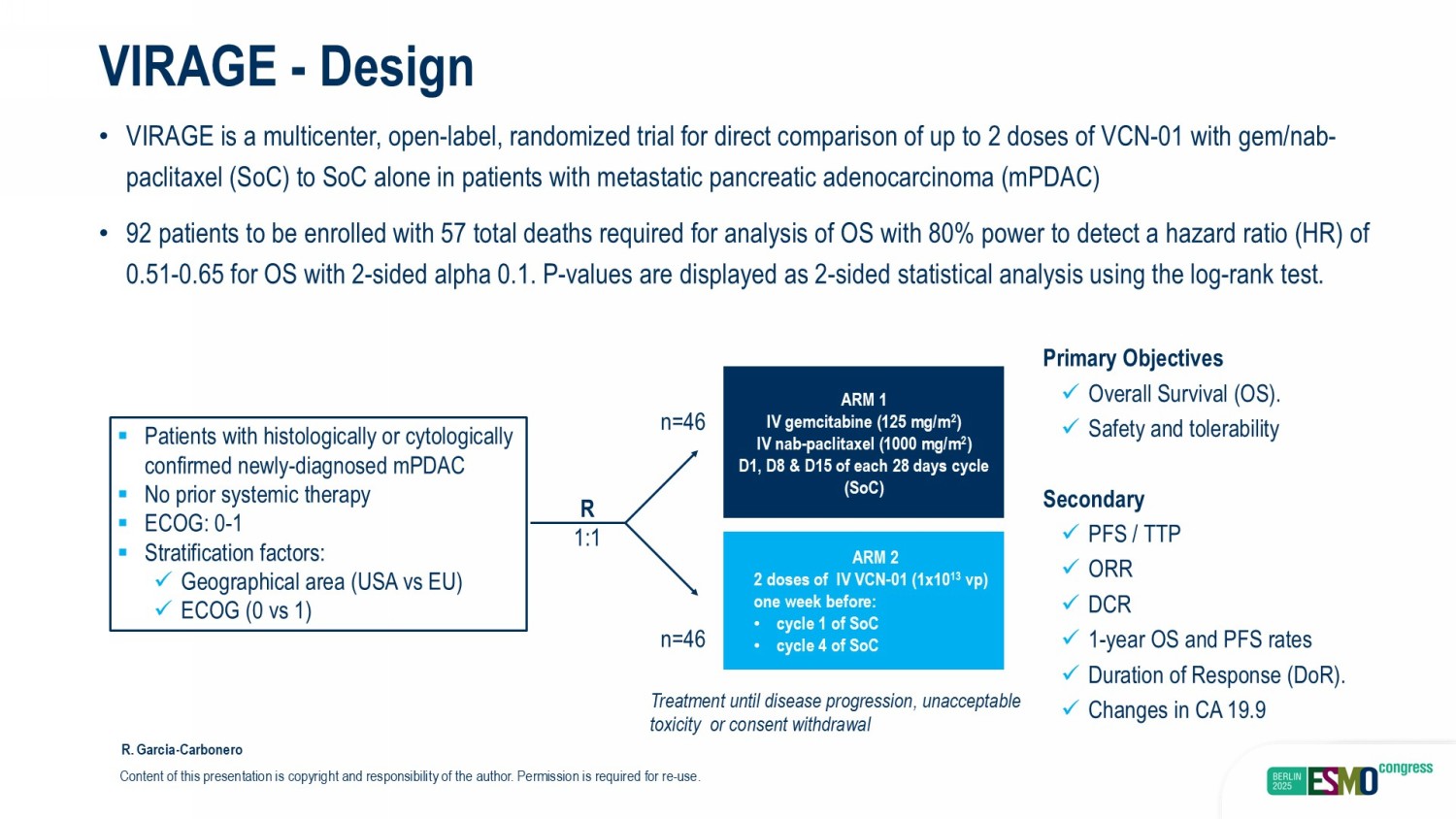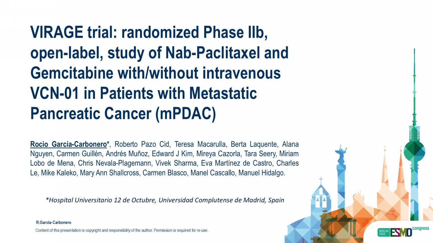 Content of this presentation is copyright and responsibility of the author. Permission is required for re - use. R.Garcia - Carbonero VIRAGE trial: randomized Phase IIb, open - label, study of Nab - Paclitaxel and Gemcitabine with/without intravenous VCN - 01 in Patients with Metastatic Pancreatic Cancer ( mPDAC ) Rocio Garcia - Carbonero * , Roberto Pazo Cid, Teresa Macarulla, Berta Laquente , Alana Nguyen, Carmen Guillén, Andrés Muñoz, Edward J Kim, Mireya Cazorla, Tara Seery, Miriam Lobo de Mena, Chris Nevala - Plagemann, Vivek Sharma, Eva Martínez de Castro, Charles Le, Mike Kaleko, Mary Ann Shallcross, Carmen Blasco, Manel Cascallo, Manuel Hidalgo . *Hospital Universitario 12 de Octubre, Universidad Complutense de Madrid, Spain