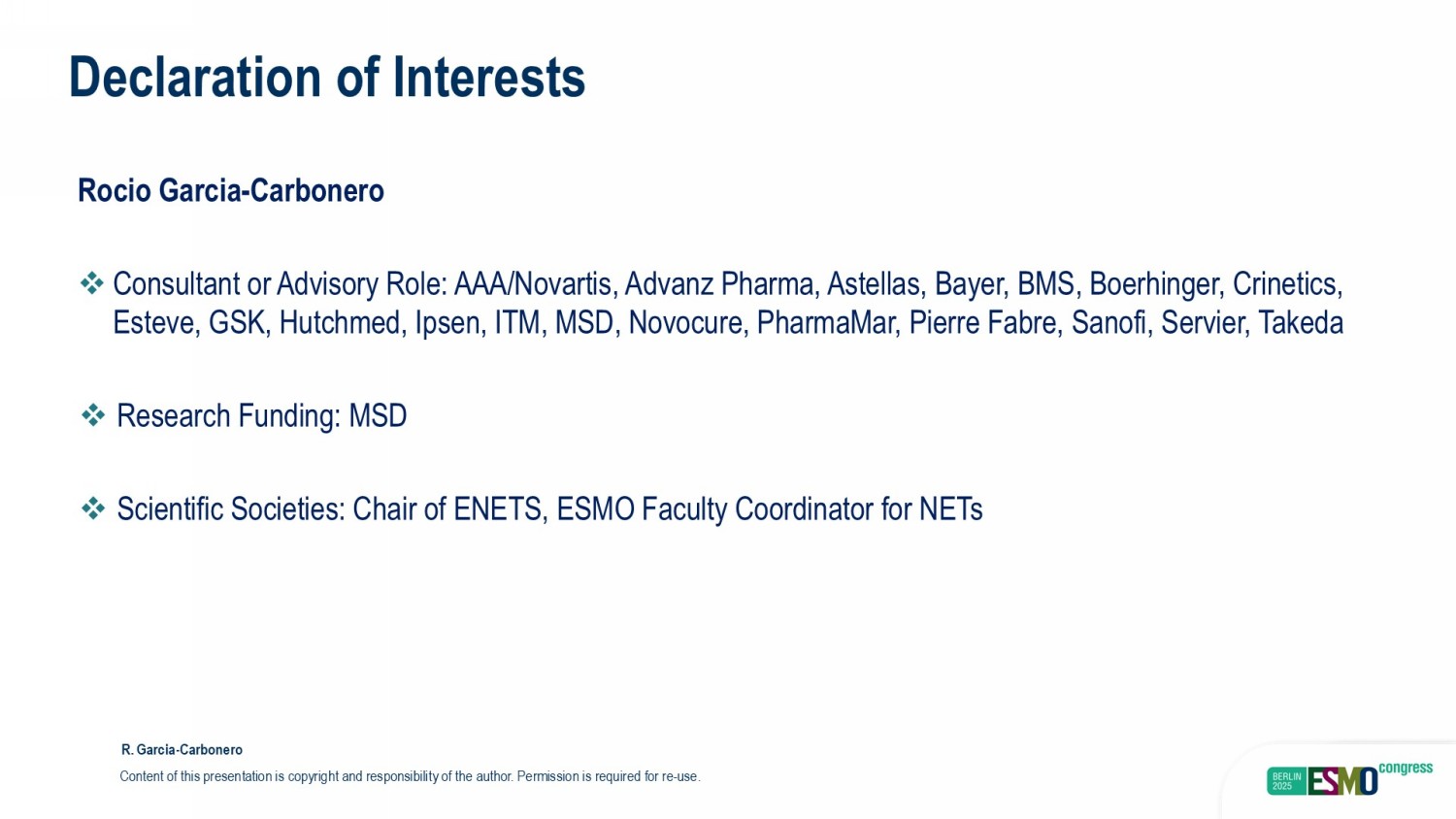 Content of this presentation is copyright and responsibility of the author. Permission is required for re - use. Declaration of Interests R. Garcia - Carbonero Rocio Garcia - Carbonero □ Consultant or Advisory Role: AAA/Novartis, Advanz Pharma, Astellas, Bayer, BMS, Boerhinger , Crinetics , Esteve, GSK, Hutchmed , Ipsen, ITM, MSD, Novocure , PharmaMar, Pierre Fabre, Sanofi, Servier, Takeda □ Research Funding: MSD □ Scientific Societies: Chair of ENETS, ESMO Faculty Coordinator for NETs