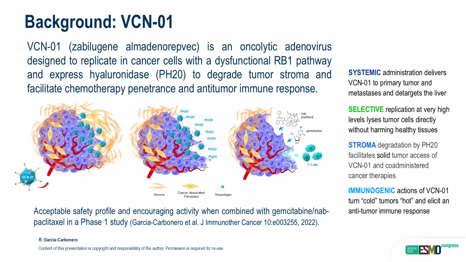Content of this presentation is copyright and responsibility of the author. Permission is required for re - use. Background: VCN - 01 R. Garcia - Carbonero VCN - 01 ( zabilugene almadenorepvec ) is an oncolytic adenovirus designed to replicate in cancer cells with a dysfunctional RB 1 pathway and express hyaluronidase (PH 20 ) to degrade tumor stroma and facilitate chemotherapy penetrance and antitumor immune response . VCN - 01 nab - paclitaxel gemcitabine T - Cells Neoantigen Cancer Associated Fibroblast Stroma STROMA degradation by PH20 facilitates solid tumor access of VCN - 01 and coadministered cancer therapies SELECTIVE replication at very high levels lyses tumor cells directly without harming healthy tissues IMMUNOGENIC actions of VCN - 01 turn “cold” tumors “hot” and elicit an anti - tumor immune response SYSTEMIC administration delivers VCN - 01 to primary tumor and metastases and detargets the liver Acceptable safety profile and encouraging activity when combined with gemcitabine/nab - paclitaxel in a Phase 1 study ( Garcia - Carbonero et al . J Immunother Cancer 10 : e 003255 , 2022 ) .