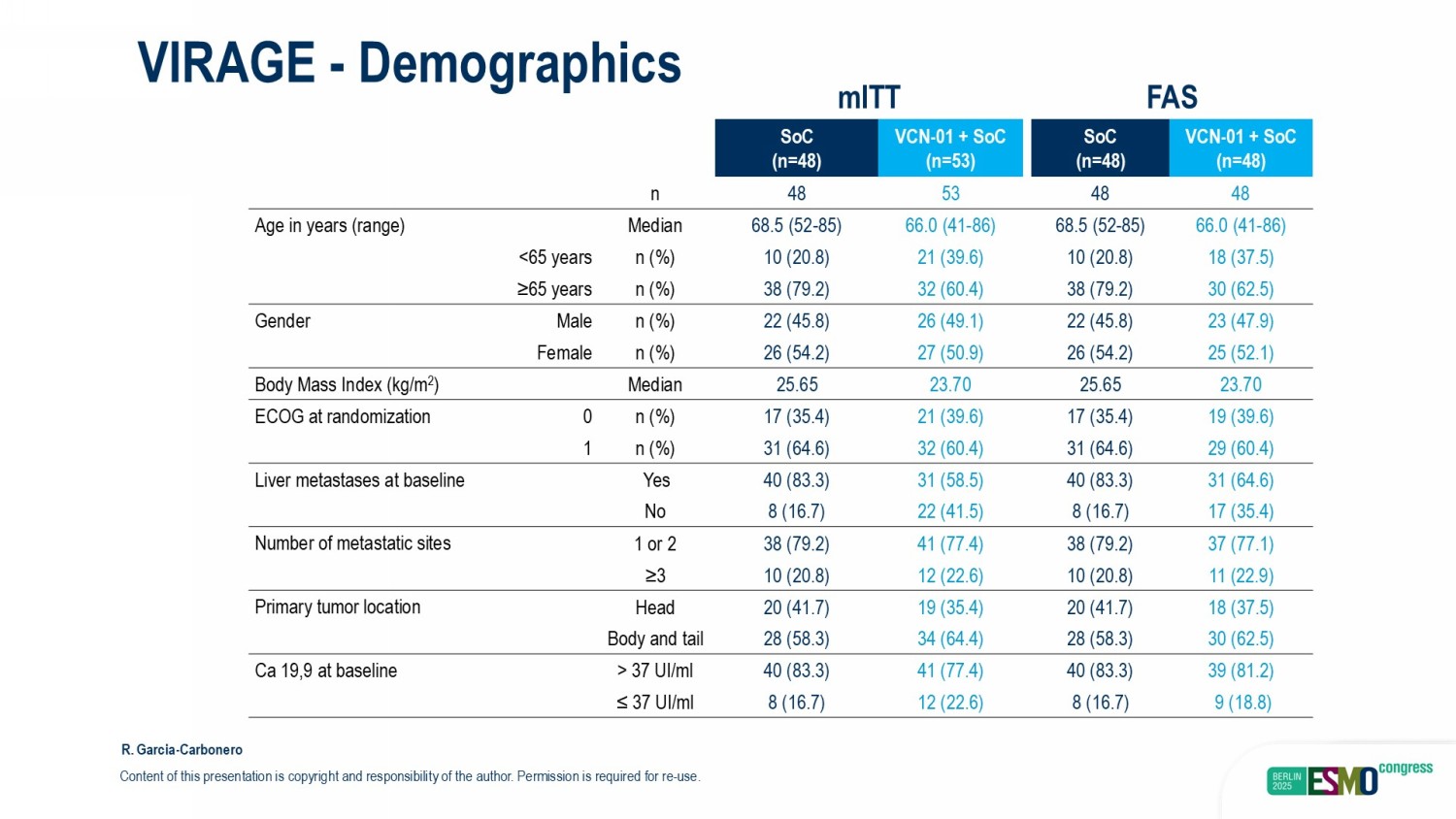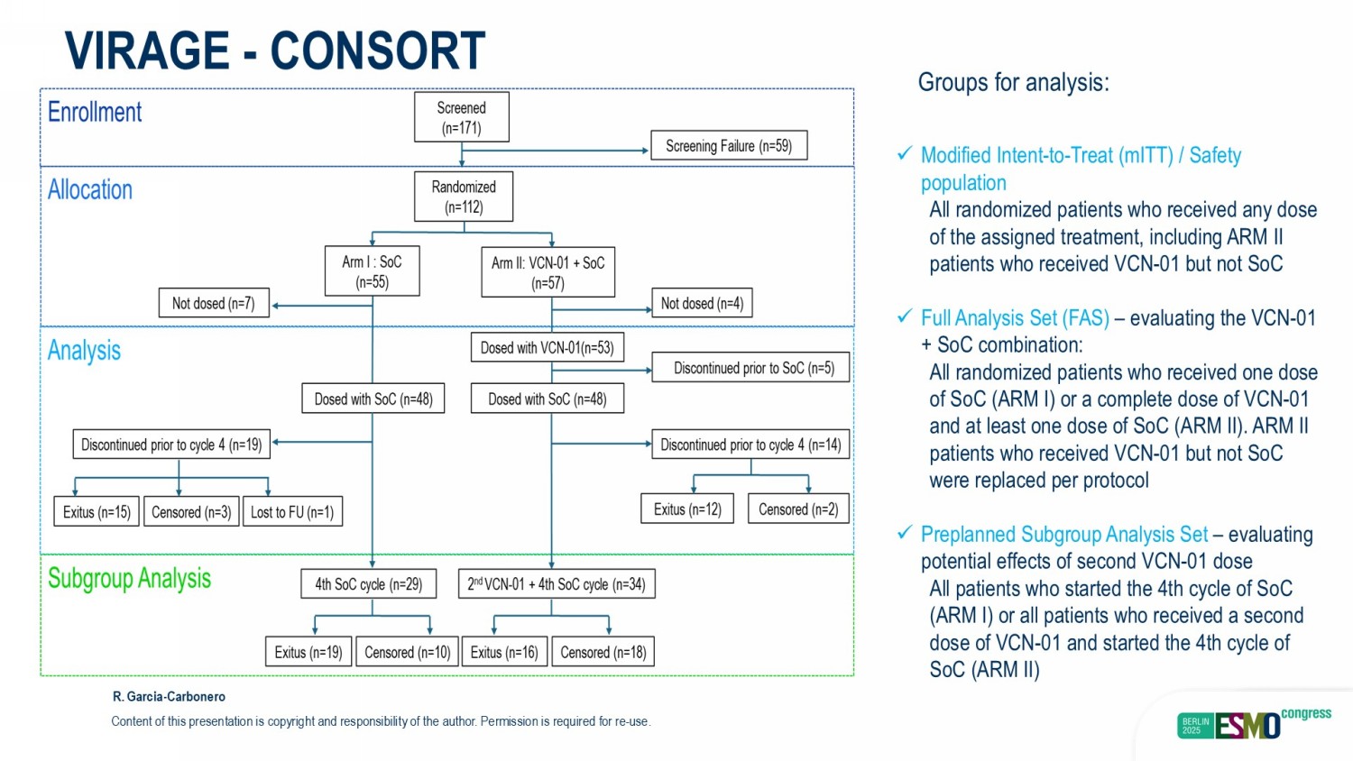 Content of this presentation is copyright and responsibility of the author. Permission is required for re - use. VIRAGE - CONSORT R. Garcia - Carbonero Groups for analysis: x Modified Intent - to - Treat ( mITT ) / Safety population All randomized patients who received any dose of the assigned treatment, including ARM II patients who received VCN - 01 but not SoC x Full Analysis Set (FAS) – evaluating the VCN - 01 + SoC combination: All randomized patients who received one dose of SoC (ARM I) or a complete dose of VCN - 01 and at least one dose of SoC (ARM II). ARM II patients who received VCN - 01 but not SoC were replaced per protocol x Preplanned Subgroup Analysis Set – evaluating potential effects of second VCN - 01 dose All patients who started the 4th cycle of SoC (ARM I) or all patients who received a second dose of VCN - 01 and started the 4th cycle of SoC (ARM II)