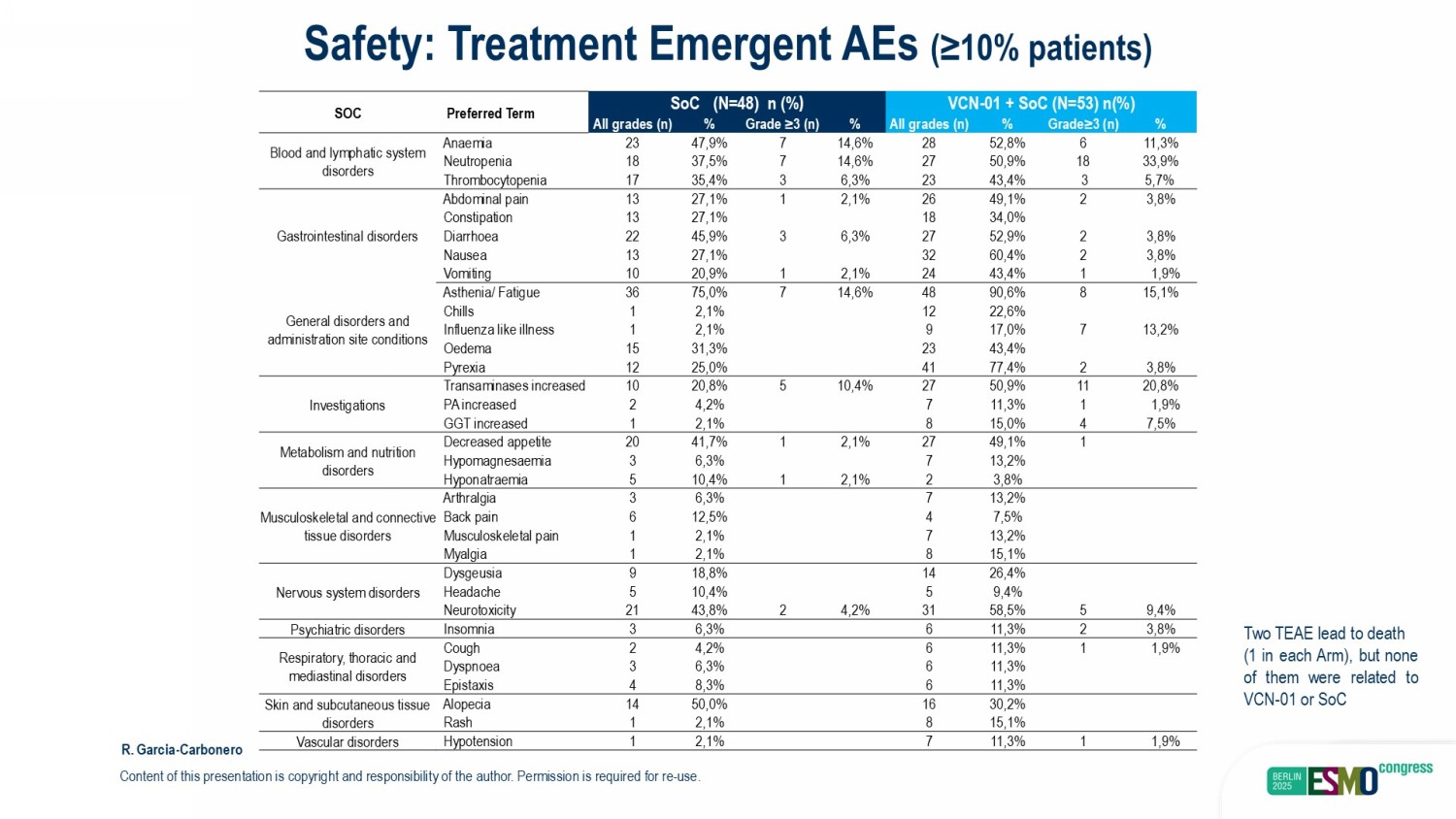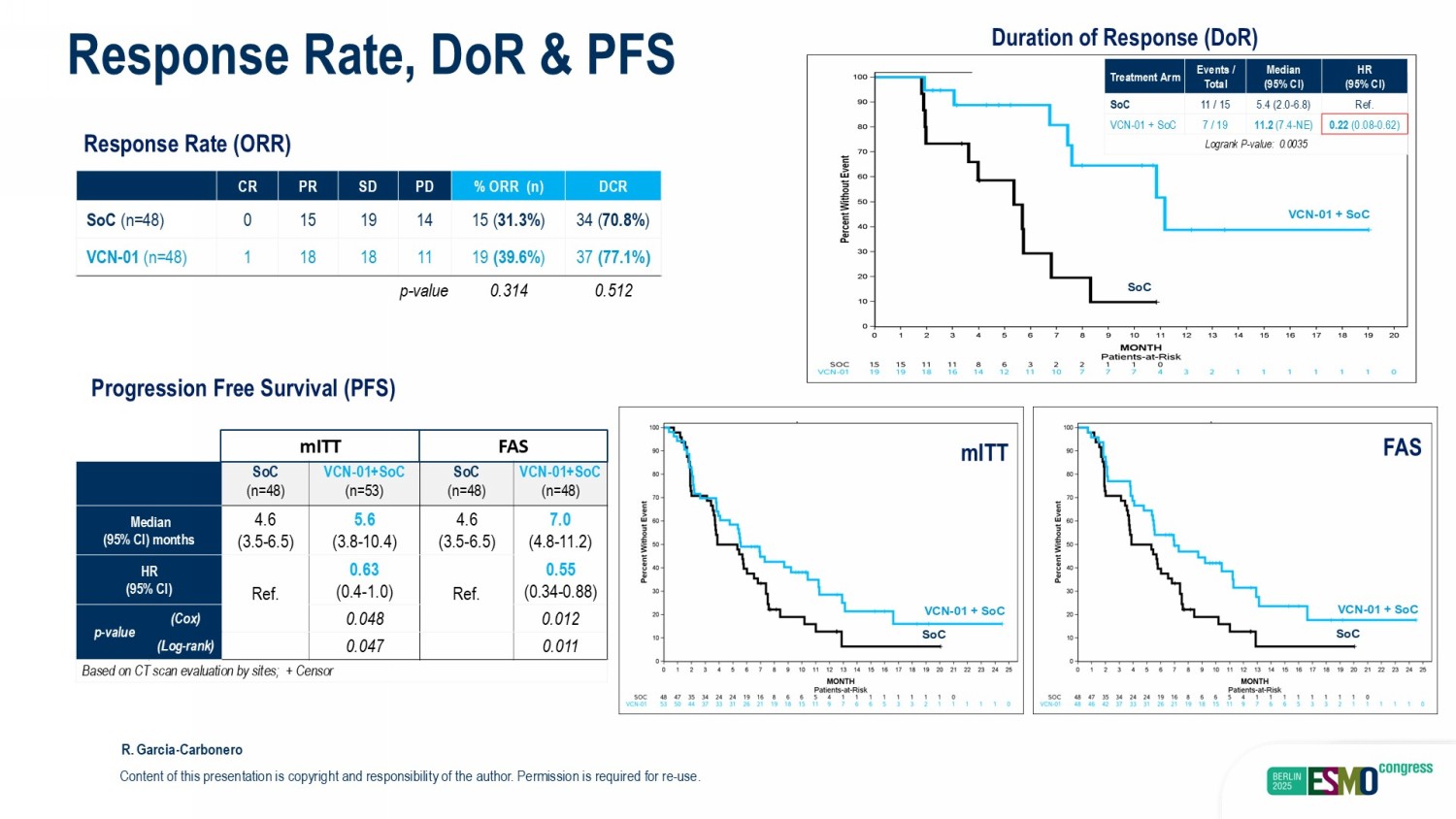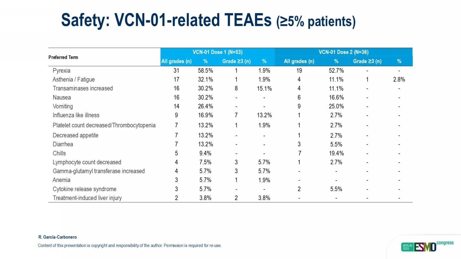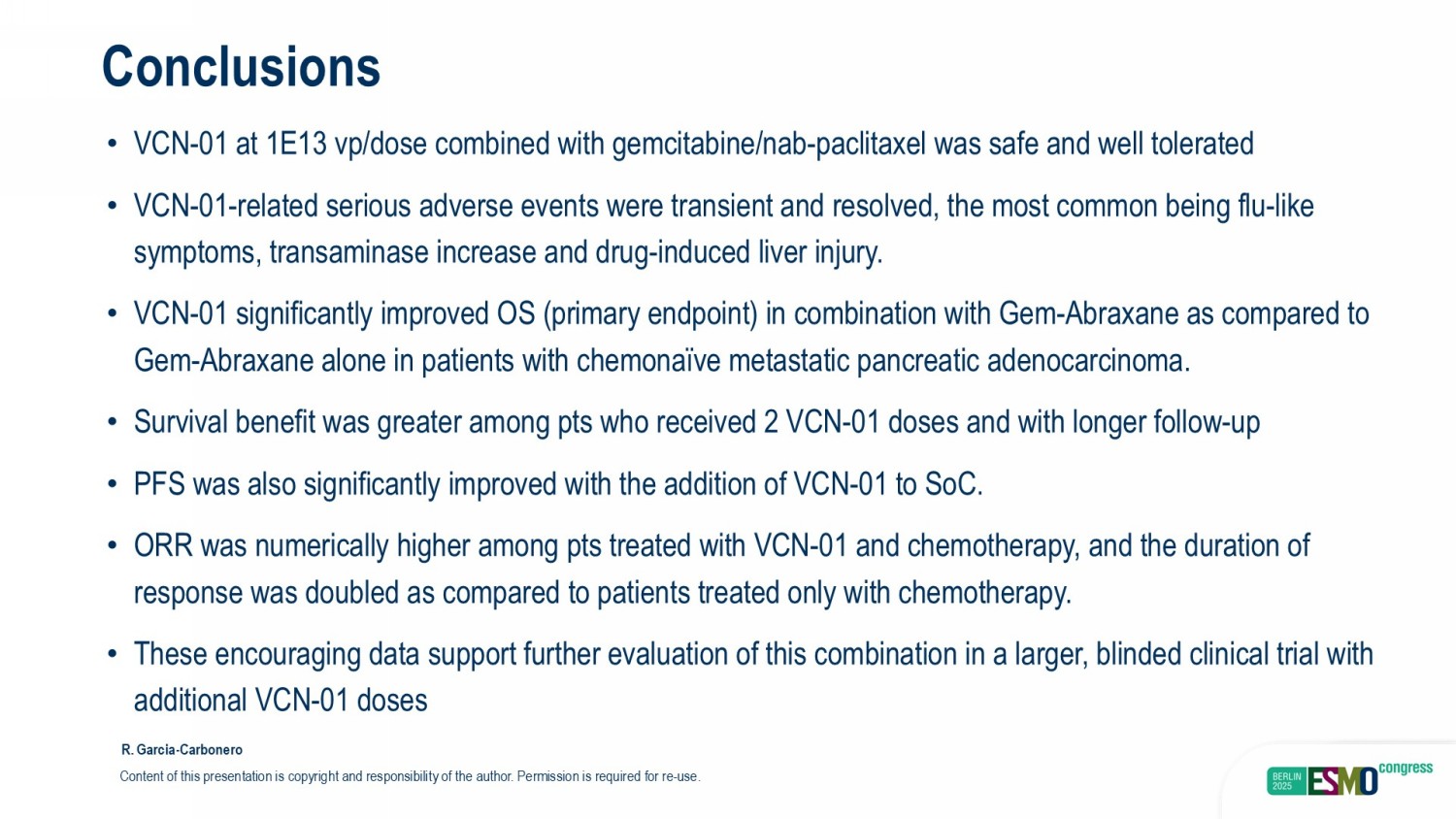 Content of this presentation is copyright and responsibility of the author. Permission is required for re - use. Conclusions R. Garcia - Carbonero • VCN - 01 at 1E13 vp /dose combined with gemcitabine/nab - paclitaxel was safe and well tolerated • VCN - 01 - related serious adverse events were transient and resolved, the most common being flu - like symptoms, transaminase increase and drug - induced liver injury. • VCN - 01 significantly improved OS (primary endpoint) in combination with Gem - Abraxane as compared to Gem - Abraxane alone in patients with chemonaïve metastatic pancreatic adenocarcinoma. • Survival benefit was greater among pts who received 2 VCN - 01 doses and with longer follow - up • PFS was also significantly improved with the addition of VCN - 01 to SoC. • ORR was numerically higher among pts treated with VCN - 01 and chemotherapy, and the duration of response was doubled as compared to patients treated only with chemotherapy. • These encouraging data support further evaluation of this combination in a larger, blinded clinical trial with additional VCN - 01 doses