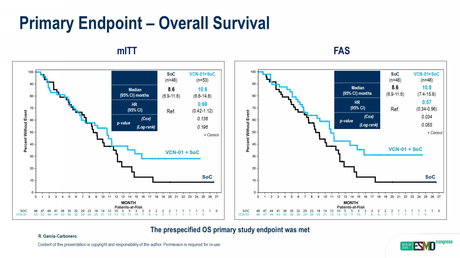 Content of this presentation is copyright and responsibility of the author. Permission is required for re - use. SoC VCN - 01 + SoC SoC VCN - 01 + SoC Primary Endpoint – Overall Survival R. Garcia - Carbonero VCN - 01+SoC (n=48) SoC (n=48) 10.8 (7.4 - 15.8) 8.6 (6.9 - 11.6) Median (95% CI) months 0.57 (0.34 - 0.96) Ref. HR (95% CI) 0.034 (Cox) p - value 0.055 (Log - rank) + Censor VCN - 01+SoC (n=53) SoC (n=48) 10.6 (6.6 - 14.8) 8.6 (6.9 - 11.6) Median (95% CI) months 0.69 (0.42 - 1.12) Ref. HR (95% CI) 0.136 (Cox) p - value 0.196 (Log - rank) + Censor mITT FAS The prespecified OS primary study endpoint was met