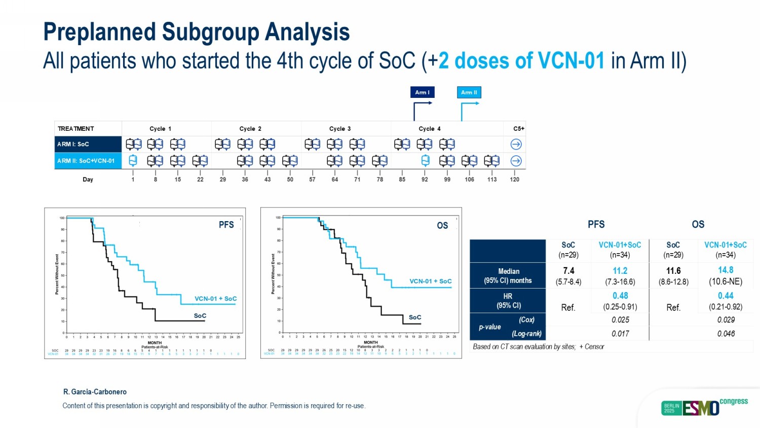 Content of this presentation is copyright and responsibility of the author. Permission is required for re - use. Preplanned Subgroup Analysis All patients who started the 4th cycle of SoC (+ 2 doses of VCN - 01 in Arm II) R. Garcia - Carbonero VCN - 01+SoC (n=34) SoC (n=29) VCN - 01+SoC (n=34) SoC (n=29) 14.8 (10.6 - NE) 11.6 (8.6 - 12.8) 11.2 (7.3 - 16.6) 7.4 (5.7 - 8.4) Median (95% CI) months 0.44 (0.21 - 0.92) Ref. 0.48 (0.25 - 0.91) Ref. HR (95% CI) 0.029 0.025 (Cox) p - value 0.046 0.017 (Log - rank) Based on CT scan evaluation by sites; + Censor PFS OS C5+ 4 Cycle 3 Cycle 2 Cycle 1 Cycle TREATMENT ARM I: SoC ARM II: SoC+VCN - 01 | 120 | 113 | 106 | 99 | 92 | 85 | 78 | 71 | 64 | 57 | 50 | 43 | 36 | 29 | 22 | 15 | 8 | 1 Day SoC VCN - 01 + SoC OS SoC VCN - 01 + SoC PFS Arm I Arm II