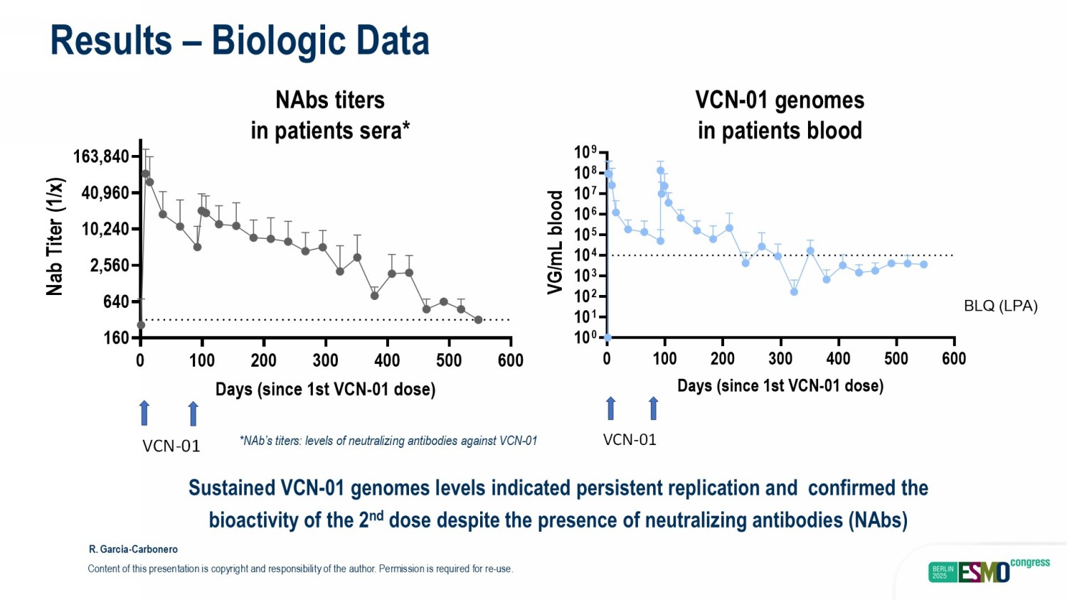 Content of this presentation is copyright and responsibility of the author. Permission is required for re - use. Results – Biologic Data R. Garcia - Carbonero 0 100 200 300 400 500 600 160 640 2,560 10,240 40,960 163,840 Days (since 1st VCN-01 dose) N a b T i t e r ( 1 / x ) VCN - 01 genomes in patients blood NAbs titers in patients sera* *NAb’s titers: levels of neutralizing antibodies against VCN - 01 Sustained VCN - 01 genomes levels indicated persistent replication and confirmed the bioactivity of the 2 nd dose despite the presence of neutralizing antibodies ( NAbs )