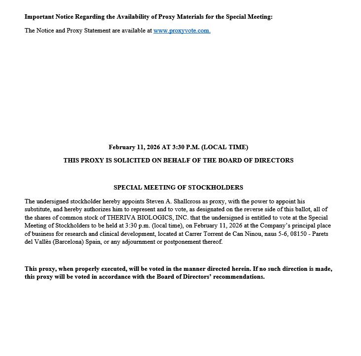 | Important Notice Regarding the Availability of Proxy Materials for the Special Meeting: The Notice and Proxy Statement are available at www.proxyvote.com. February 11, 2026 AT 3:30 P.M. (LOCAL TIME) THIS PROXY IS SOLICITED ON BEHALF OF THE BOARD OF DIRECTORS SPECIAL MEETING OF STOCKHOLDERS The undersigned stockholder hereby appoints Steven A. Shallcross as proxy, with the power to appoint his substitute, and hereby authorizes him to represent and to vote, as designated on the reverse side of this ballot, all of the shares of common stock of THERIVA BIOLOGICS, INC. that the undersigned is entitled to vote at the Special Meeting of Stockholders to be held at 3:30 p.m. (local time), on February 11, 2026 at the Company’s principal place of business for research and clinical development, located at Carrer Torrent de Can Ninou, naus 5-6, 08150 - Parets del Vallès (Barcelona) Spain, or any adjournment or postponement thereof. This proxy, when properly executed, will be voted in the manner directed herein. If no such direction is made, this proxy will be voted in accordance with the Board of Directors’ recommendations. |