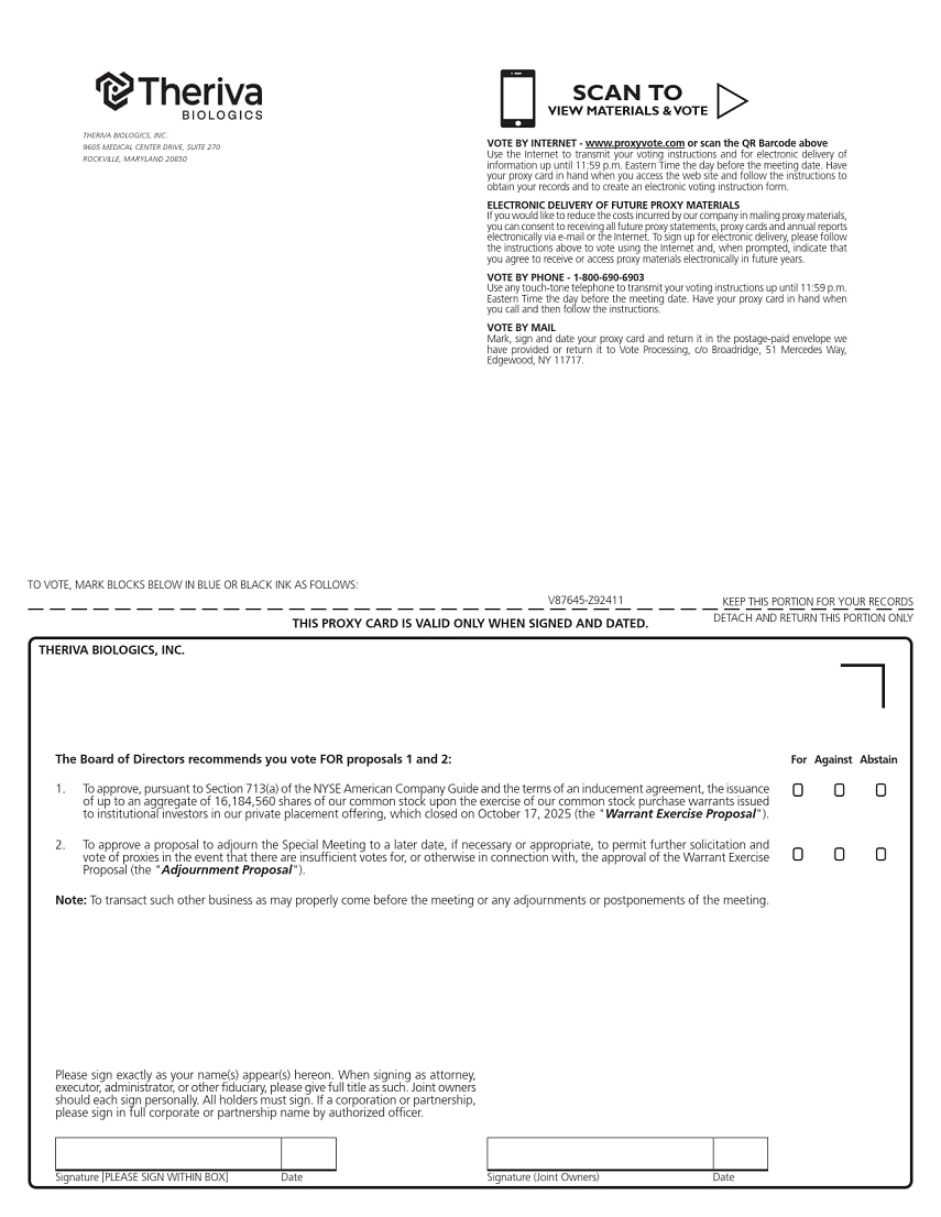 Signature [PLEASE SIGN WITHIN BOX] Date Signature (Joint Owners) DateTO VOTE, MARK BLOCKS BELOW IN BLUE OR BLACK INK AS FOLLOWS:KEEP THIS PORTION FOR YOUR RECORDS THIS PROXY CARD IS VALID ONLY WHEN SIGNED AND DATED. DETACH AND RETURN THIS PORTION ONLYV87645-Z92411For Against Abstain ! ! !! ! !THERIVA BIOLOGICS, INC.The Board of Directors recommends you vote FOR proposals 1 and 2:Note: To transact such other business as may properly come before the meeting or any adjournments or postponements of the meeting.1. To approve, pursuant to Section 713(a) of the NYSE American Company Guide and the terms of an inducement agreement, the issuance of up to an aggregate of 16,184,560 shares of our common stock upon the exercise of our common stock purchase warrants issued to institutional investors in our private placement offering, which closed on October 17, 2025 (the "Warrant Exercise Proposal"). 2. To approve a proposal to adjourn the Special Meeting to a later date, if necessary or appropriate, to permit further solicitation and vote of proxies in the event that there are insufficient votes for, or otherwise in connection with, the approval of the Warrant Exercise Proposal (the "Adjournment Proposal").Please sign exactly as your name(s) appear(s) hereon. When signing as attorney, executor, administrator, or other fiduciary, please give full title as such. Joint owners should each sign personally. All holders must sign. If a corporation or partnership, please sign in full corporate or partnership name by authorized officer.SCAN TOVIEW MATERIALS & VOTE wTHERIVA BIOLOGICS, INC. 9605 MEDICAL CENTER DRIVE, SUITE 270 ROCKVILLE, MARYLAND 20850VOTE BY INTERNET - www.proxyvote.com or scan the QR Barcode above Use the Internet to transmit your voting instructions and for electronic delivery of information up until 11:59 p.m. Eastern Time the day before the meeting date. Have your proxy card in hand when you access the web site and follow the instructions to obtain your records and to create an electronic voting instruction form. ELECTRONIC DELIVERY OF FUTURE PROXY MATERIALS If you would like to reduce the costs incurred by our company in mailing proxy materials, you can consent to receiving all future proxy statements, proxy cards and annual reports electronically via e-mail or the Internet. To sign up for electronic delivery, please follow the instructions above to vote using the Internet and, when prompted, indicate that you agree to receive or access proxy materials electronically in future years. VOTE BY PHONE - 1-800-690-6903 Use any touch-tone telephone to transmit your voting instructions up until 11:59 p.m. Eastern Time the day before the meeting date. Have your proxy card in hand when you call and then follow the instructions. VOTE BY MAIL Mark, sign and date your proxy card and return it in the postage-paid envelope we have provided or return it to Vote Processing, c/o Broadridge, 51 Mercedes Way, Edgewood, NY 11717.V87646-Z92411
