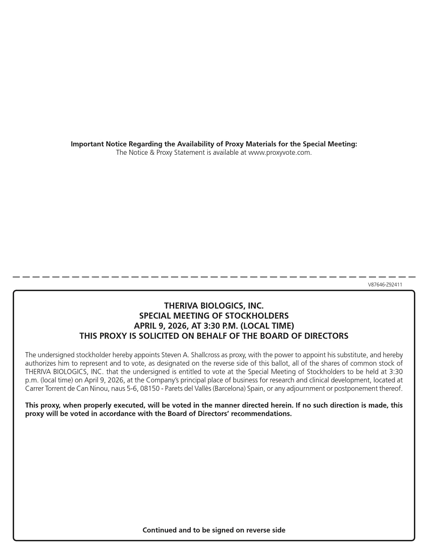 Important Notice Regarding the Availability of Proxy Materials for the Special Meeting: The Notice & Proxy Statement is available at www.proxyvote.com.THERIVA BIOLOGICS, INC. SPECIAL MEETING OF STOCKHOLDERS APRIL 9, 2026, AT 3:30 P.M. (LOCAL TIME) THIS PROXY IS SOLICITED ON BEHALF OF THE BOARD OF DIRECTORS The undersigned stockholder hereby appoints Steven A. Shallcross as proxy, with the power to appoint his substitute, and hereby authorizes him to represent and to vote, as designated on the reverse side of this ballot, all of the shares of common stock of THERIVA BIOLOGICS, INC. that the undersigned is entitled to vote at the Special Meeting of Stockholders to be held at 3:30 p.m. (local time) on April 9, 2026, at the Company’s principal place of business for research and clinical development, located at Carrer Torrent de Can Ninou, naus 5-6, 08150 - Parets del Vallès (Barcelona) Spain, or any adjournment or postponement thereof. This proxy, when properly executed, will be voted in the manner directed herein. If no such direction is made, this proxy will be voted in accordance with the Board of Directors’ recommendations.Continued and to be signed on reverse side