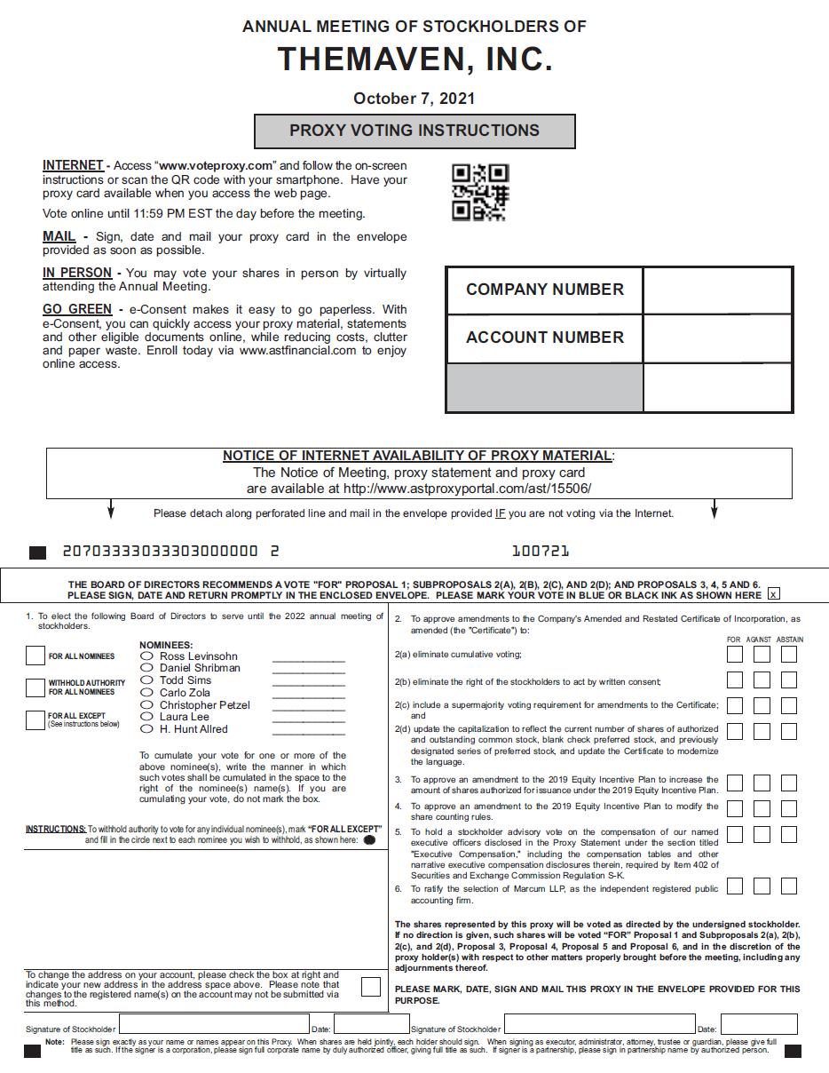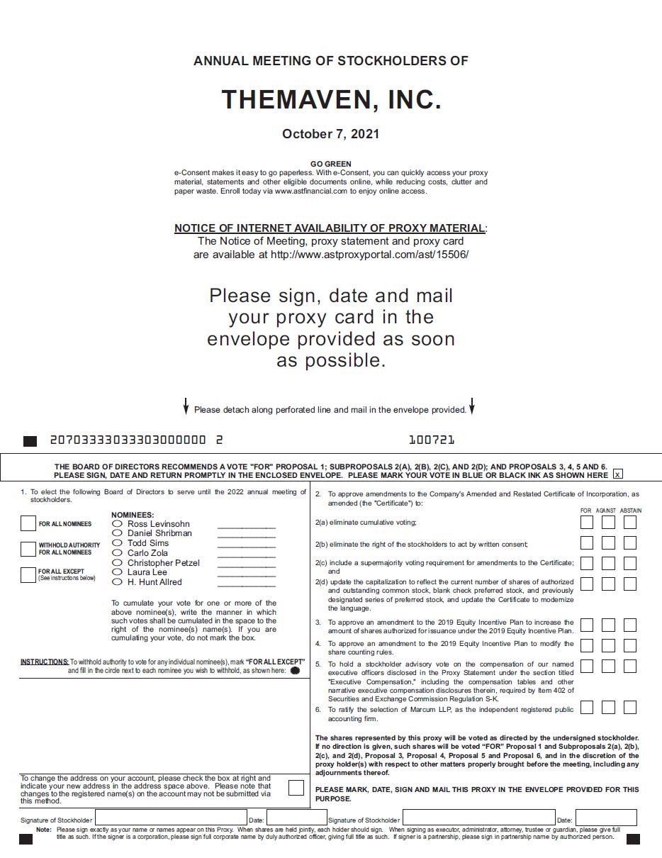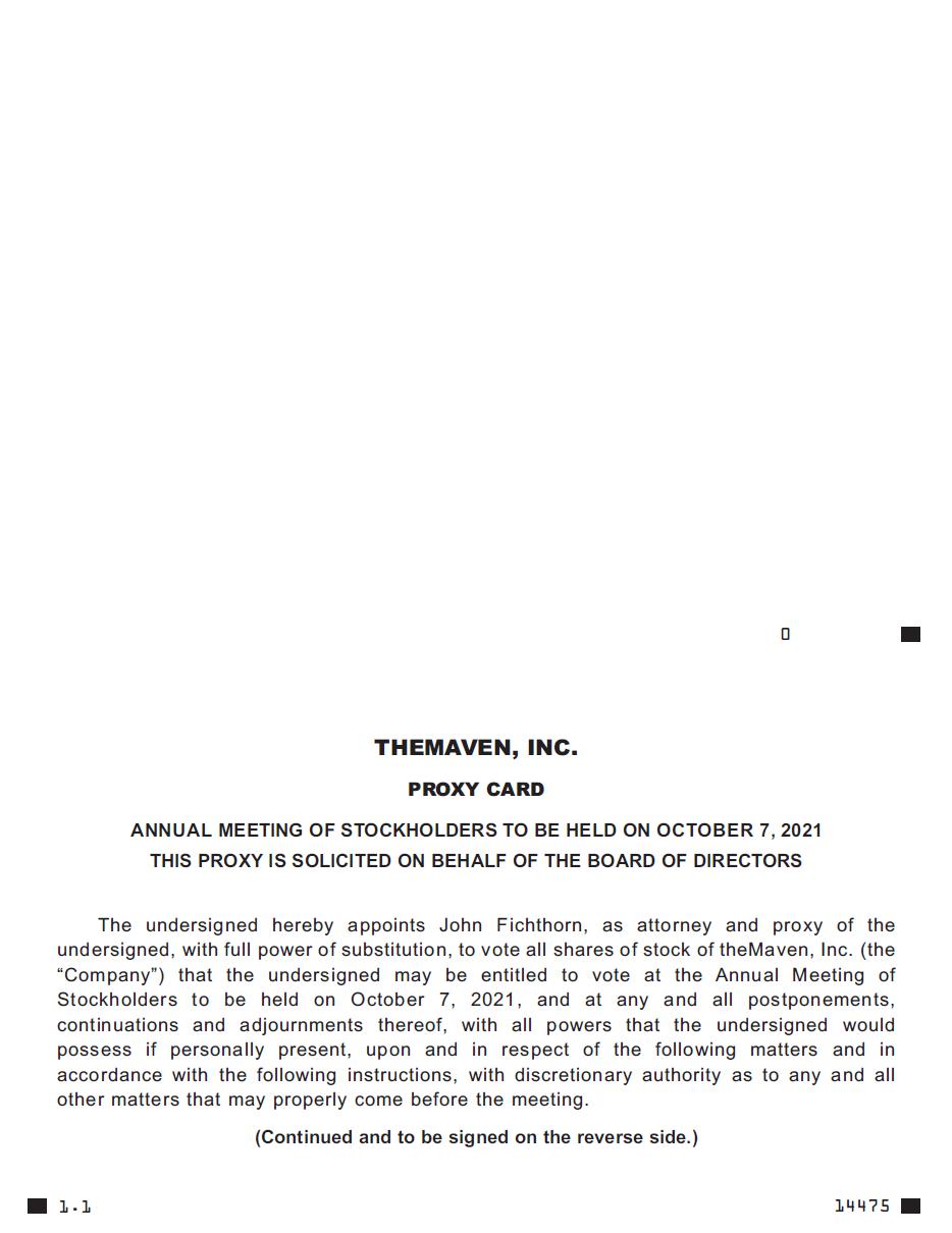 It is our pleasure to invite you to this year’s Annual Meeting of the Stockholders of theMaven, Inc. (the “Annual Meeting”). Due to the public health impact of the coronavirus (“COVID-19”) pandemic, and out of concern for the health and safety of our stockholders, directors, and members of management, the Annual Meeting will be held on Thursday, October 7, 2021 at 9:00 a.m., Eastern Time, in a virtual meeting format only. There will be no physical location for stockholders to attend the Annual Meeting. Stockholders will be able to listen and vote, regardless of their physical location, by logging on to https://web.lumiagm.com/273495257 using the meeting password and the 11-digit control number found in the proxy materials previously distributed to you. The password for the meeting is themaven2021. If you hold your shares through an intermediary, such as a bank, broker, or other nominee, you must register in advance to attend the Annual Meeting. To register, you must submit proof of your “legal proxy” obtained from your bank, broker, or nominee reflecting your holdings, along with your name and email address, to American Stock Transfer & Trust Company, LLC: (i) by email to proxy@astfinancial.com; (ii) by facsimile to 718.765.8730; or (iii) by mail to American Stock Transfer & Trust Company, LLC, Attn: Proxy Tabulation Department, 6201 15th Avenue, Brooklyn, New York 11219. Please reference “theMaven 2021 Annual Meeting October 7, 2021” in the subject line. Obtaining a “legal proxy” may take several days and stockholders are advised to register as far in advance as possible. Requests for registration must be labeled as “Legal Proxy” and be received no later than 5:00 p.m., Eastern Time, on September 30, 2021. You will receive a confirmation email from American Stock Transfer & Trust Company, LLC of your registration. If you plan to participate in the Annual Meeting, please see the Instructions for the Virtual Annual Meeting section in the attached Proxy Statement. The purpose of the Annual Meeting is to vote on the following: