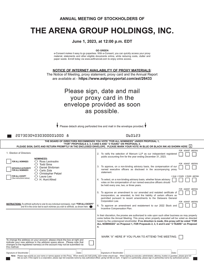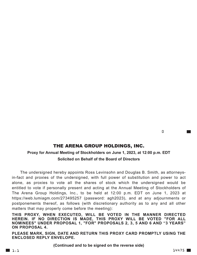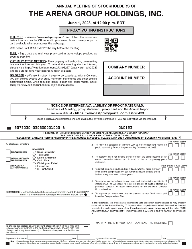 It is our pleasure to invite you to this year’s Annual Meeting of the Stockholders of The Arena Group Holdings Inc. (the “Annual Meeting”). This year, the Annual Meeting will be held on Thursday, June 1, 2023 at 12:00 p.m., Eastern Time, in a virtual meeting format only. There will be no physical location for stockholders to attend the Annual Meeting. Stockholders will be able to listen and vote, regardless of their physical location, by logging on to https://web.lumiagm.com/273495257 using the meeting password and the 11-digit control number found in the proxy materials previously distributed to you. The password for the meeting is agh2023. If you hold your shares through an intermediary, such as a bank, broker, or other nominee, you must register in advance to attend the Annual Meeting. To register, you must submit proof of your “legal proxy” obtained from your bank, broker, or nominee reflecting your holdings, along with your name and email address, to American Stock Transfer & Trust Company, LLC: (i) by email to proxy@astfinancial.com; (ii) by facsimile to 718.765.8730; or (iii) by mail to American Stock Transfer & Trust Company, LLC, Attn: Proxy Tabulation Department, 6201 15th Avenue, Brooklyn, New York 11219. Please reference “Arena Group 2023 Annual Meeting June 1, 2023” in the subject line. Obtaining a “legal proxy” may take several days and stockholders are advised to register as far in advance as possible. Requests for registration must be labeled as “Legal Proxy” and be received no later than 5:00 p.m., Eastern Time, on May 25, 2023. You will receive a confirmation email from American Stock Transfer & Trust Company, LLC of your registration. If you plan to participate in the Annual Meeting, please see the section titled “Instructions for the Virtual Annual Meeting” in the attached Proxy Statement. The purpose of the Annual Meeting is to vote on the following: