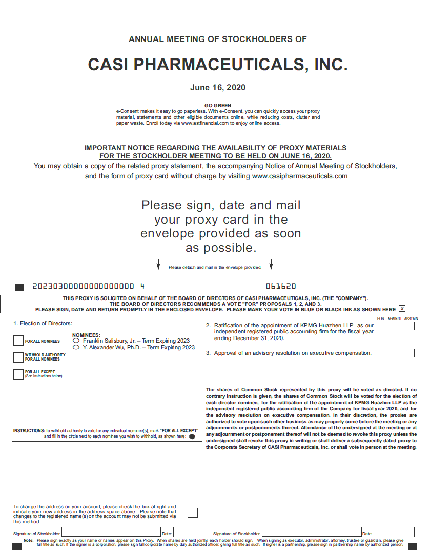ANNUAL MEETING OF STOCKHOLDERS OF CASI PHARMACEUTICALS, INC. June 16, 2020 GO GREEN eConsent makes it easy to go paperless. With eConsent, you can quickly access your proxy material, statements and other eligible documents online, while reducing costs, clutter and paper waste. Enroll today via www.astfinancial.com to enjoy online access. IMPORTANT NOTICE REGARDING THE AVAILABILITY OF PROXY MATERIALS FOR THE STOCKHOLDER MEETING TO BE HELD ON JUNE 16, 2020. You may obtain a copy of the related proxy statement, the accompanying Notice of Annual Meeting of Stockholders, and the form of proxy card without charge by visiting www.casipharmaceuticals.com Please sign, date and mail your proxy card in the envelope provided as soon as possible. Please detach and mail in the envelope provided. 20230300000000000000 4 061620 INSTRUCTIONS: To withhold authority to vote for any individual nominee(s), mark “FOR ALL EXCEPT” and fill in the circle next to each nominee you wish to withhold, as shown here: 1. Election of Directors: O Franklin Salisbury, Jr. – Term Expiring 2023 O Y. Alexander Wu, Ph.D. – Term Expiring 2023 FOR ALL NOMINEES WITHHOLD AUTHORITY FOR ALL NOMINEES FOR ALL EXCEPT (See instructions below) NOMINEES:To change the address on your account, please check the box at right and indicate your new address in the address space above. Please note that changes to the registered name(s) on the account may not be submitted viathis method. FOR AGAINST ABSTAIN 2. Ratification of the appointment of KPMG Huazhen LLP as our independent registered public accounting firm for the fiscal year ending December 31, 2020.3. Approval of an advisory resolution on executive compensation. The shares of Common Stock represented by this proxy will be voted as directed. If no contrary instruction is given, the shares of Common Stock will be voted for the election of each director nominee, for the ratification of the appointment of KPMG Huazhen LLP as the independent registered public accounting firm of the Company for fiscal year 2020, and for the advisory resolution on executive compensation. In their discretion, the proxies are authorized to vote upon such other business as may properly come before the meeting or any adjournments or postponements thereof. Attendance of the undersigned at the meeting or at any adjournment or postponement thereof will not be deemed to revoke this proxy unless the undersigned shall revoke this proxy in writing or shall deliver a subsequently dated proxy to the Corporate Secretary of CASI Pharmaceuticals, Inc. or shall vote in person at the meeting. Signature of Stockholder Date: Signature of Stockholder Date: Note: Please sign exactly as your name or names appear on this Proxy. When shares are held jointly, each holder should sign. When signing as executor, administrator, attorney, trustee or guardian, please give full title as such. If the signer is a corporation, please sign full corporate name by duly authorized officer, giving full title as such. If signer is a partnership, please sign in partnership name by authorized person.