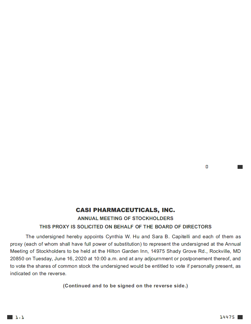 0 CASI PHARMACEUTICALS, INC. ANNUAL MEETING OF STOCKHOLDERS THIS PROXY IS SOLICITED ON BEHALF OF THE BOARD OF DIRECTORS The undersigned hereby appoints Cynthia W. Hu and Sara B. Capitelli and each of them as proxy (each of whom shall have full power of substitution) to represent the undersigned at the Annual Meeting of Stockholders to be held at the Hilton Garden Inn, 14975 Shady Grove Rd., Rockville, MD 20850 on Thursday, June 16, 2020 at 10:00 a.m. and at any adjournment or postponement thereof, and to vote the shares of common stock the undersigned would be entitled to vote if personally present, as indicated on the reverse. (Continued and to be signed on the reverse side.) 1.1 14475