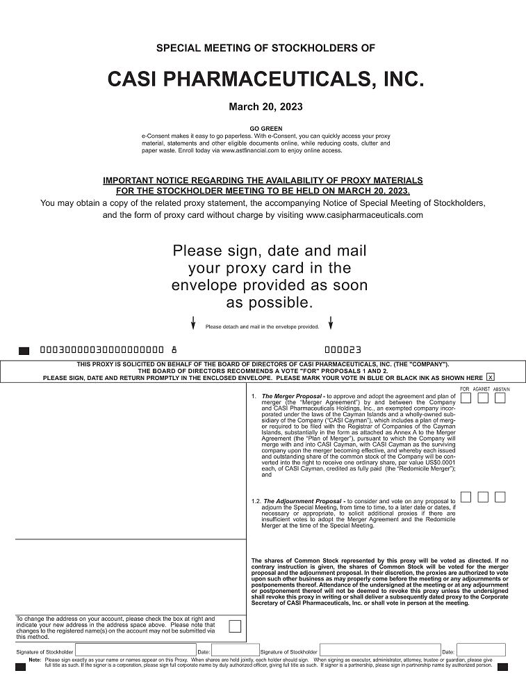 SPECIAL MEETING OF STOCKHOLDERS OF CASI PHARMACEUTICALS, INC. March 20, 2023 GO GREEN e-Consent makes it easy to go paperless. Withe-Consent,you can quickly access your proxy material, statements and other eligible documents online, while reducing costs, clutter and paper waste. Enroll today via www.astfinancial.com to enjoy online access. IMPORTANT NOTICE REGARDING THE AVAILABILITY OF PROXY MATERIALS FOR THE STOCKHOLDER MEETING TO BE HELD ON MARCH 20, 2023. You may obtain a copy of the related proxy statement, the accompanying Notice of Special Meeting of Stockholders, and the form of proxy card without charge by visiting www.casipharmaceuticals.com Please sign, date and mail your proxy card in the envelope provided as soon as possible. Please detach and mail in the envelope provided. 00030000030000000000 8 000023 To change the address on your account, please check the box at right and indicate your new address in the address space above. Please note that changes to the registered name(s) on the account may not be submitted via this method. Signature of Stockholder Date: Signature of Stockholder Date: Note: Please sign exactly as your name or names appear on this Proxy. When shares are held jointly, each holder should sign. When signing as executor, administrator, attorney, trustee or guardian, please give full title as such. If the signer is a corporation, please sign full corporate name by duly authorized officer, giving full title as such. If signer is a partnership, please sign in partnership name by authorized person.