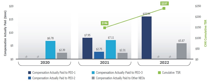 | 48 // CHESAPEAKE ENERGY CORPORATION Name and Principal Position Fiscal Year Salary ($) Bonus ($)(a) Stock Awards ($)(b) Option Awards ($) Non-Equity Incentive Plan Compensation ($)(c) All Other Compensation ($)(d) Total ($) Domenic J. (“Nick”) Dell’Osso, Jr. President and Chief Executive Officer 2022 800,000 – 6,434,727 – 970,000 23,213 8,227,940 2021 758,965 – 5,699,725 – 1,208,000 22,247 7,688,937 2020 750,376 – 300,000 – 2,922,273 23,040 3,995,689 Mohit Singh Executive Vice President and Chief Financial Officer 2022 525,000 – 2,806,674 – 509,250 291,706 4,132,630 2021 10,096 880,000 1,604,883 – – 23,591 2,518,570 Joshua J. Viets Executive Vice President and Chief Operating Officer 2022(e) 421,966 500,000 3,930,541 – 475,300 234,644 5,562,451 Benjamin E. Russ Executive Vice President – General Counsel and Corporate Secretary 2022 400,001 – 1,369,256 – 310,400 31,620 2,111,277 2021 348,472 – 1,382,439 – 483,200 20,693 2,234,804 Michael A. Wichterich Executive Chairman 2022 650,000 – 2,553,397 – – 15,857 3,219,254 2021 812,122 – 1,389,459 – – 2,554 2,204,135 (a) Reflects sign-on bonus paid to Messrs. Singh and Viets upon commencing employment with the Company in 2021 and 2022. This award was made to compen-sate for earned but unvested awards at their prior employer that were forfeited upon joining our team. (b) These amounts represent the aggregate grant date fair value of the stock awards granted, determined in accordance with FASB ASC Topic 718, excluding the effect of estimated forfeitures. The value ultimately realized by the executive upon the actual vesting of the awards may be more or less than the grant date fair value. For restricted stock units (RSUs), values are based on the closing price of the Company's common stock on the grant date. For performance share unit awards (PSUs), the Company utilized the Monte Carlo simulation to determine the grant date fair market value. The grant date fair value of the PSUs was deter-mined based on the PSUs awarded vesting at target, which is the performance the Company believed was probable on the grant date. The maximum opportunity of the 2022 PSUs for each NEO as of the grant date is as follows: Messrs. Dell'Osso $10,468,165, Singh $4,565,965, Viets $4,565,965, Russ $2,227,496 and Wichterich $4,153,886. Both RSUs and PSUs receive dividend equivalent rights to unvested stock that are earned at the time the underlying shares vest. The assumptions used by the Company in calculating the amounts related to stock awards granted are incorporated by reference to Note 13 of the consolidated financial statements included in the Company’s 2022 Annual Report on Form 10-K. (c) The 2022 amounts in this column represent annual incentive plan program awards earned with respect to the designated year and paid in the following year, as described under the caption “2022 Annual Incentive Program” beginning on page 38. (d) The table below provides additional information on the amounts reported in the All Other Compensation column of the Summary Compensation Table for 2022. (e) 2022 was Mr. Viets’ first year as an NEO and he was hired on February 1, 2022. The Compensation Committee has reviewed and discussed with management the Compensation Discussion and Analysis set forth above. Based on the review and discussion, the Compensation Committee recommended to the Board of Directors that the Compen-sation Discussion and Analysis be included in this Proxy Statement. MEMBERS OF THE COMPENSATION COMMITTEE Brian Steck (Chair) Timothy S. Duncan Benjamin C. Duster, IV Compensation Committee Report Summary Compensation Table for 2022 23-2075-2 C2.1 P50 |