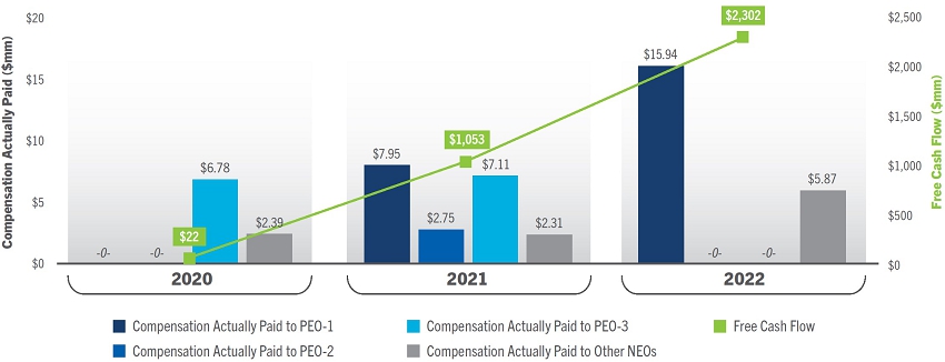 As shown in the Pay Versus Performance Table above, we selected Free Cash Flow as the measure to link compensation actually paid to Company performance. As described in the 2022 AIP Performance Goals and Calculation of Payout Factor section on page 40, our annual incentive program assigns Free Cash Flow with the highest weighting among all metrics. Free Cash Flow not only serves as a key factor in annual cash payouts to our executives but also functions as a determinant in share price appreciation. In the following graph, we show the relationship between compensation actually paid and our Free Cash Flow for our PEOs and Other NEOs over the last three years.